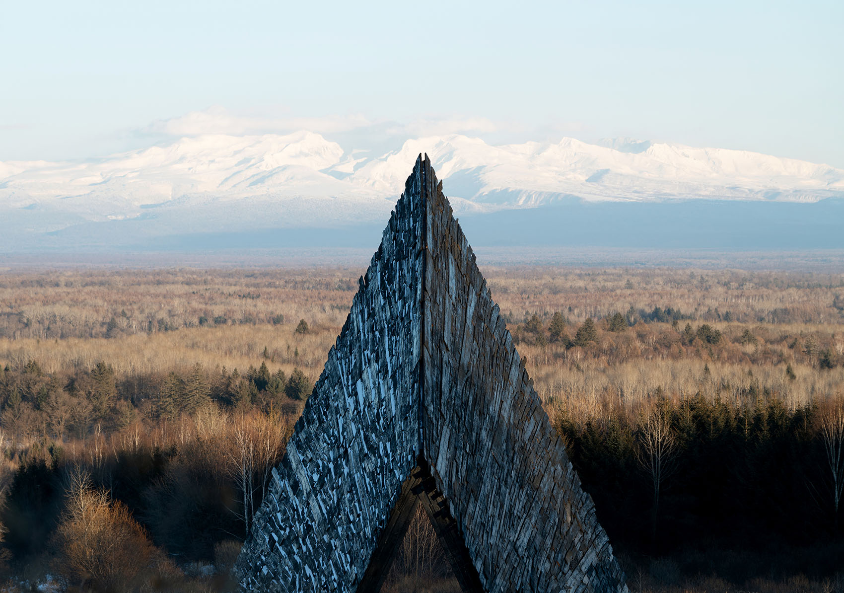 In the winter terrain of Changbai Mountain, snow blankets the ground and the light narrows; low temperatures and wind make lingering a rare luxury. The massif in the distance is vast and steadfast, shaping both the view and the mood. Oriented toward Changbai, Prism Shelter offers travelers a place to empty the mind and rest for a moment: to arrive, to enter, to stay—then, in waiting, to glimpse the mountain as it appears and disappears.