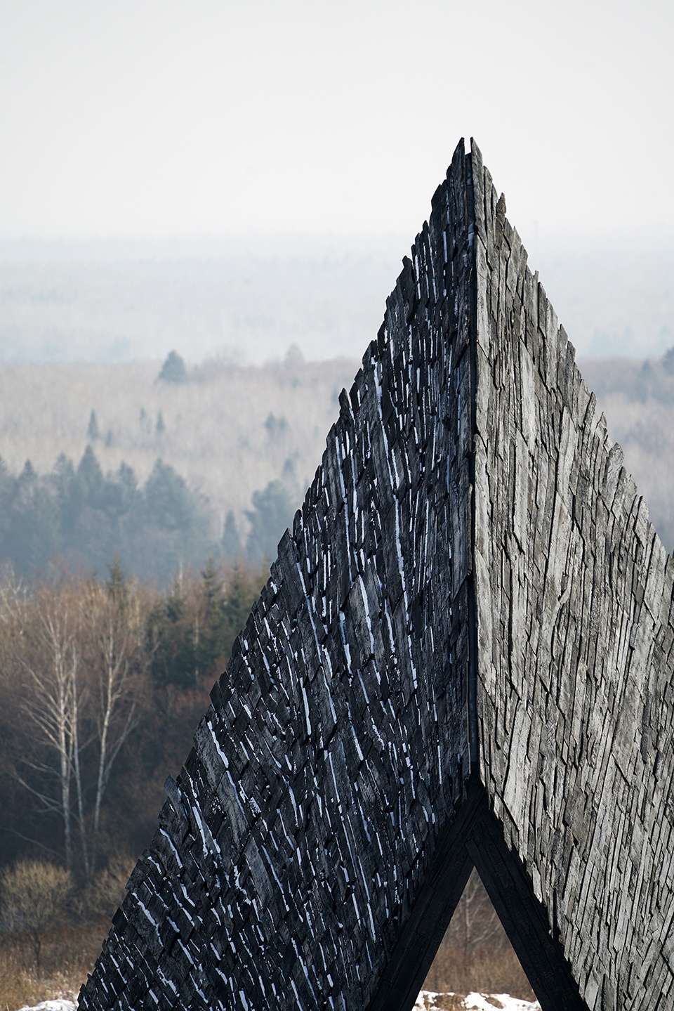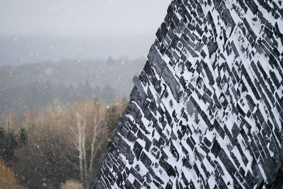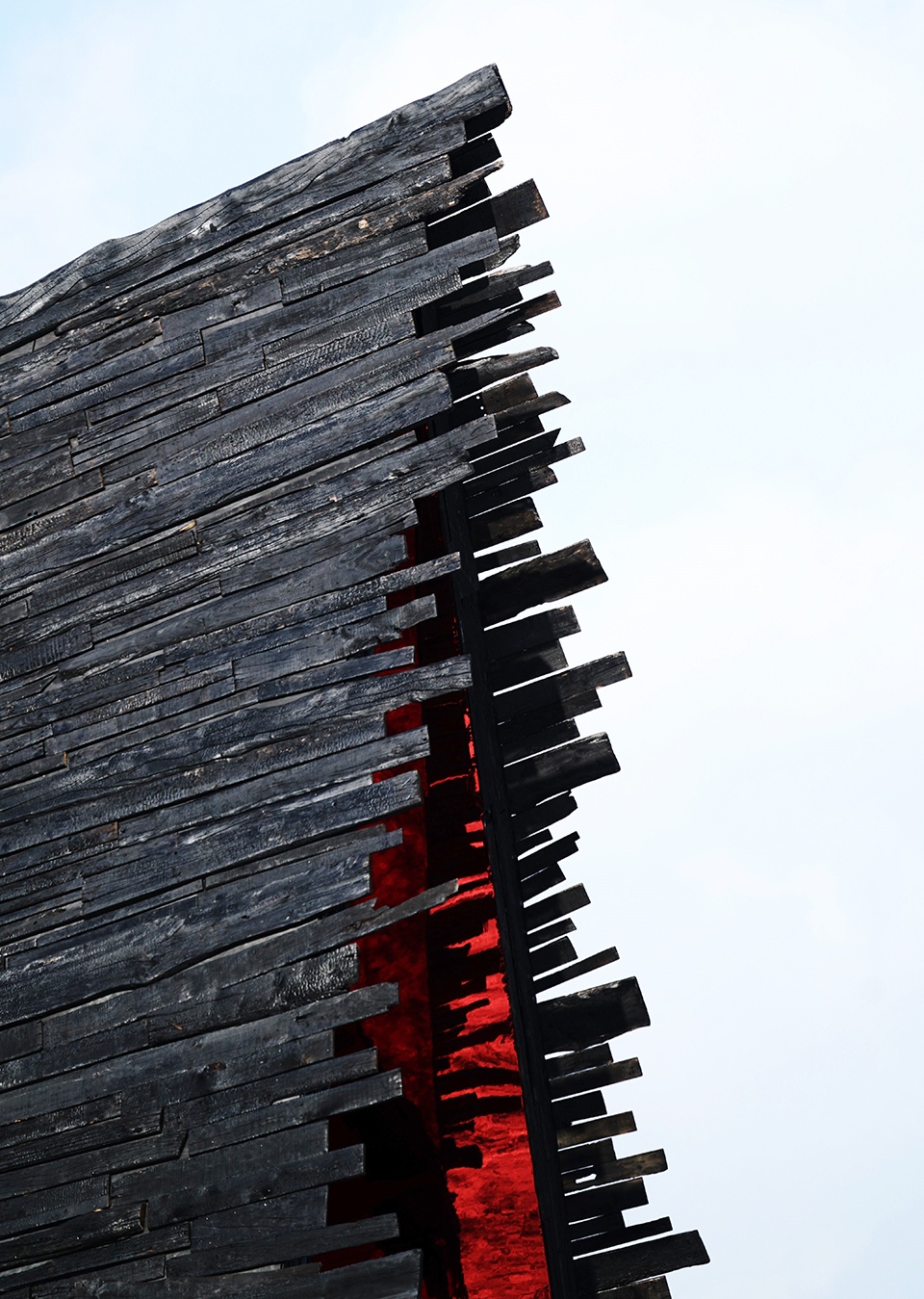 木材来自周边城市的回收渠道,并经过碳化处理以提升耐候性,适应低温与雨雪。深黑、粗糙的碳化木表皮像一层可靠外壳:质感带来物理层面的安全感;线性条纹与整体朝向共同把视线引向长白山。粗粝、深色、带有火痕质感的外表皮,让作品在凌冽环境中呈现朴素而坚定的力量。