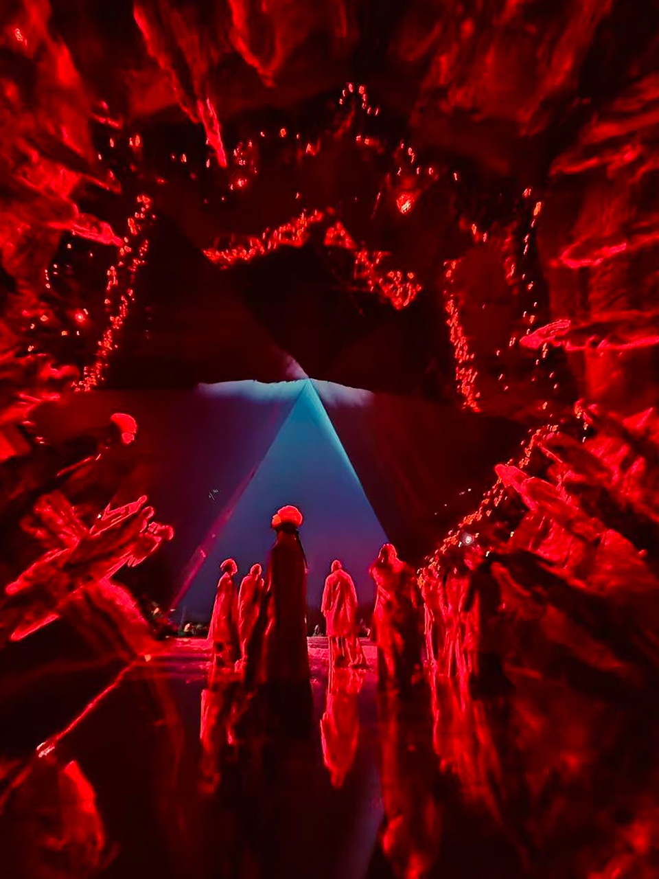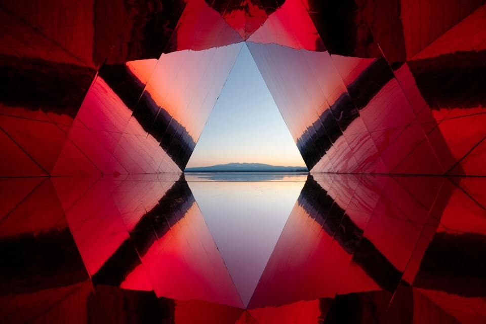 “棱镜庇护所”是一件可以让人进入的大地艺术装置,也是一座光学的建筑。创作的核心是其营造的精神感受与具身体验:外部以庇护所的形态邀请人进入与停留,内部以光学机制重构观看方式。