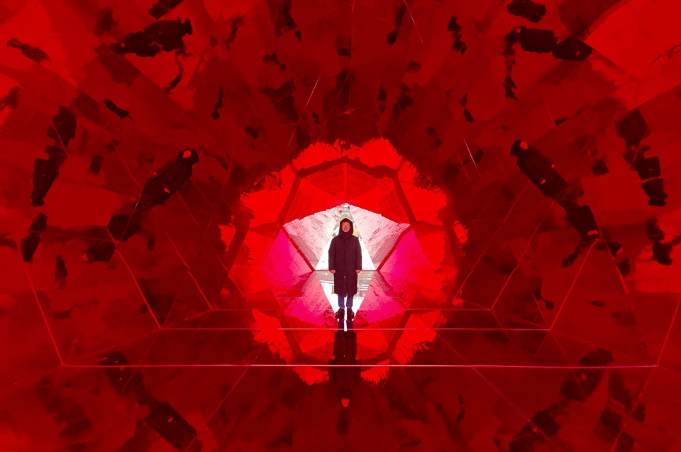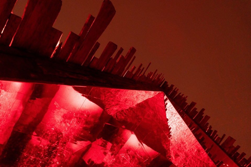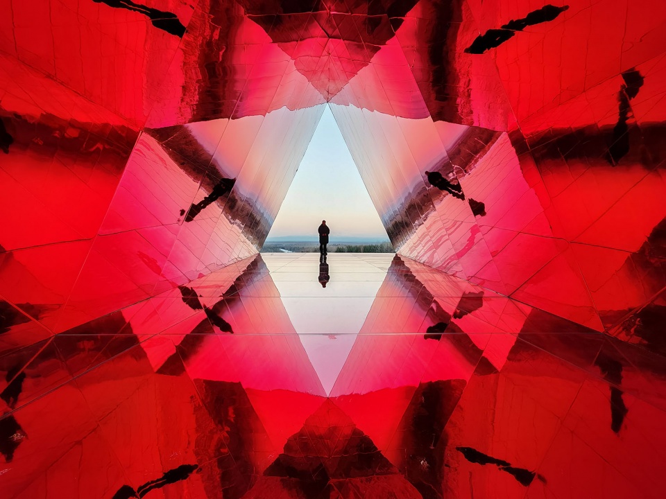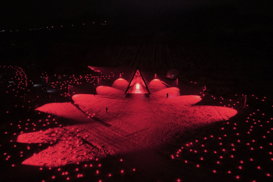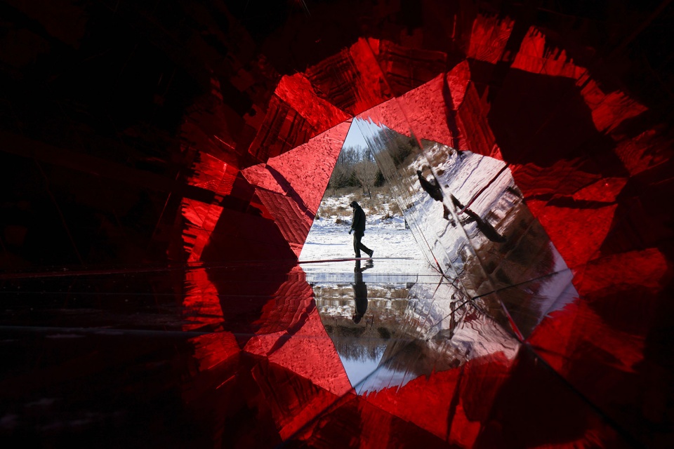 内部热烈的红色仿佛长白山地底涌动的火山能量,雪野中搏动的心脏,也是为行旅者点燃的微光。人们步入其中,通过特别的光学设计与远处的雪山相遇:熟悉的峰峦被分解、重组,化为一幅流动的视觉诗,并为世代居于此的居民,带来既陌生又亲切的观看体验。