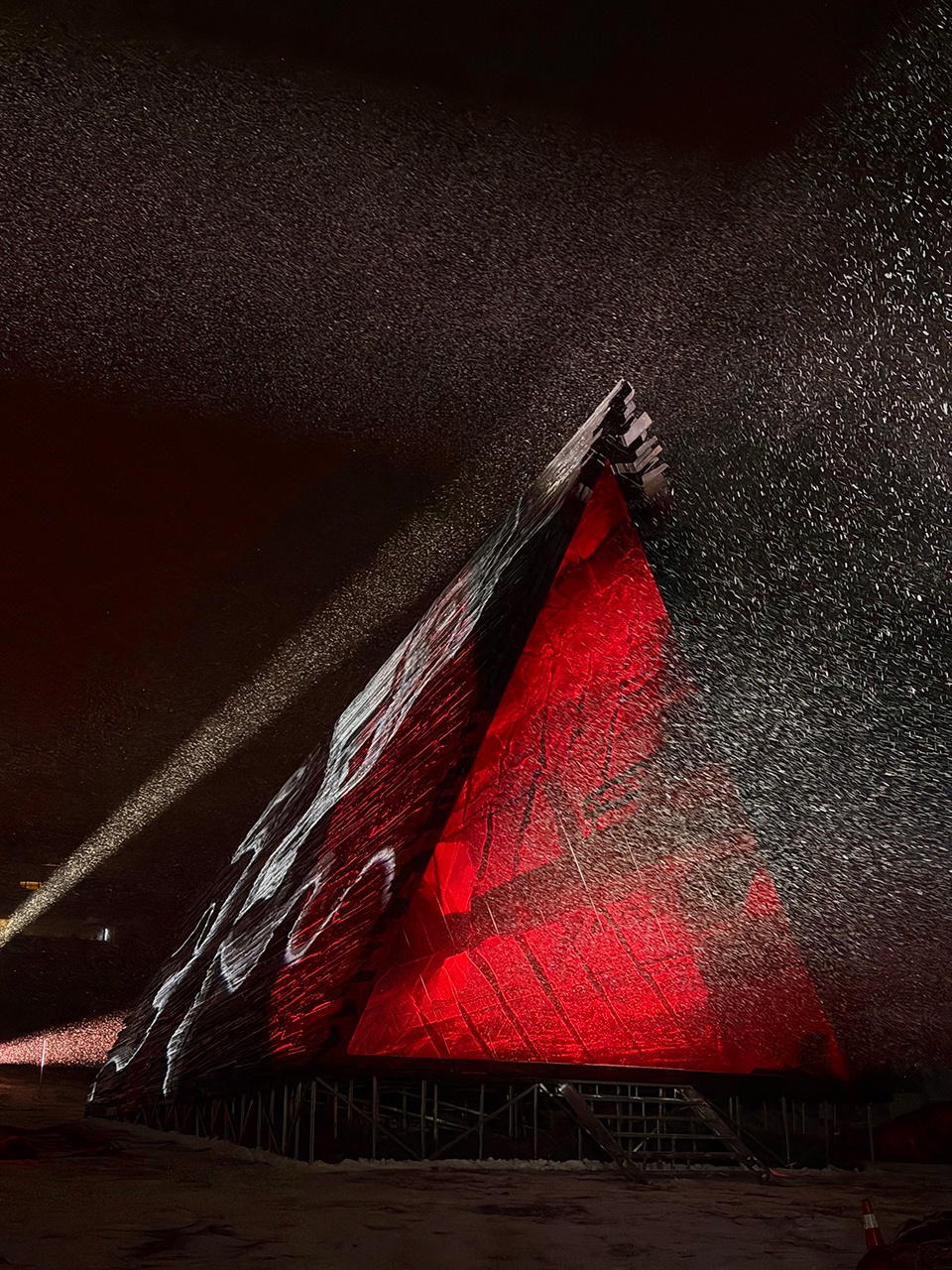 这座建筑是「愚行」玛丽黛佳自然剧|||参与式艺术实验现场的一部分,在大雪的映衬下,被赋予了震撼而独特的体验。置身于长白山,我们试图在更极端的气候条件与更辽阔的地理尺度中,进一步探索人与自然之间尚未被命名的张力、共鸣与可能性。