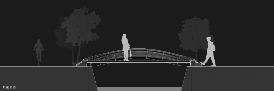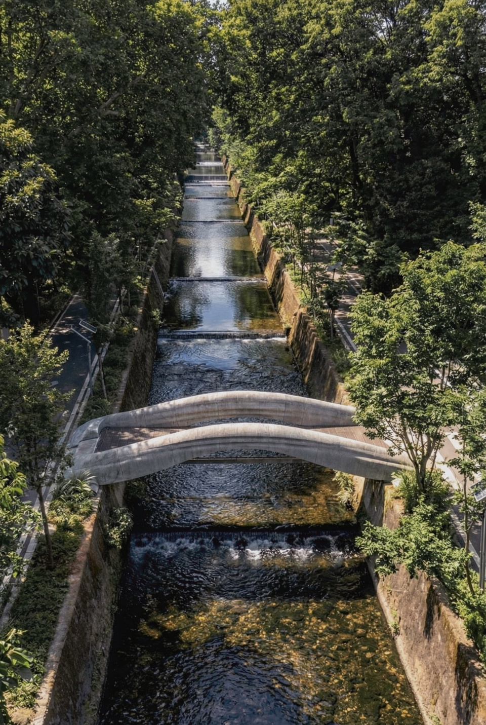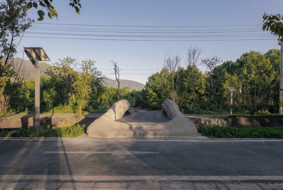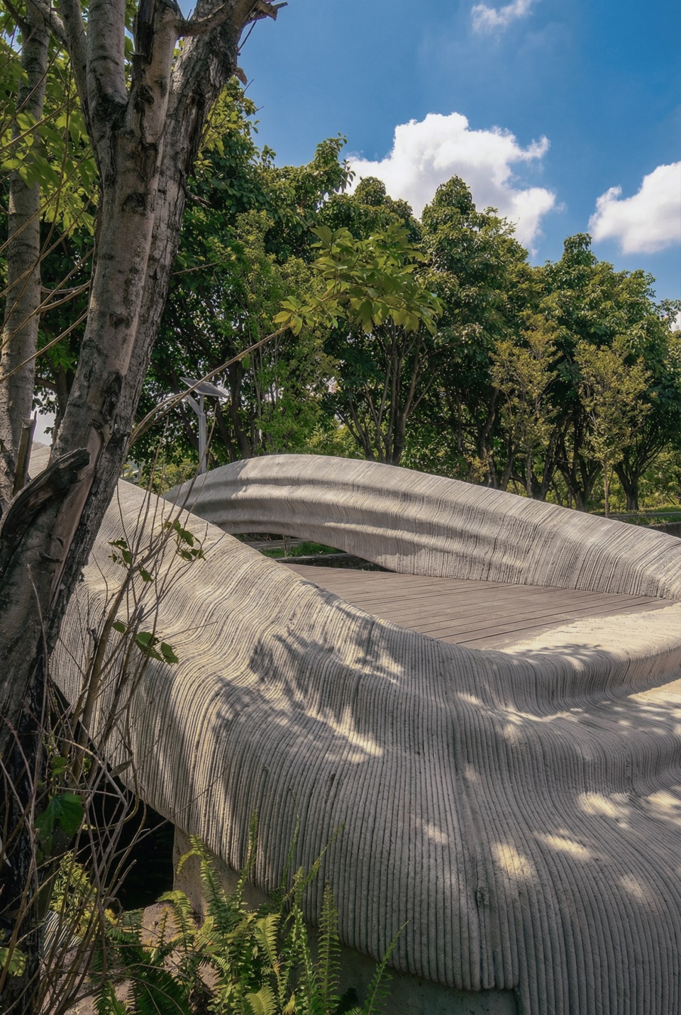 Employing 3D concrete printing technology, the design of Xizhou Wanhua Stream Bridge No.1 deconstructs the traditional pedestrian bridge by integrating steps, parapets, and handrails into a unified form. This creates a landscape feature that is walkable, seatable, leanable, grippable, and also serves as an exceptional vantage point for distant viewing. The design not only addresses functional requirements such as riverbank connectivity, elevation changes, pedestrian safety, and structural integrity but also endows the bridge with aesthetic significance through its fluid morphology. Its form, evoking the delicate folds of petals, appears to bloom along the Wanhua Stream.