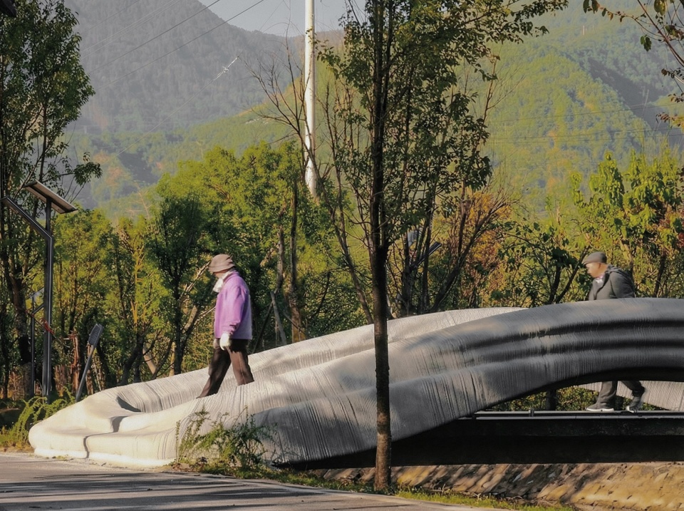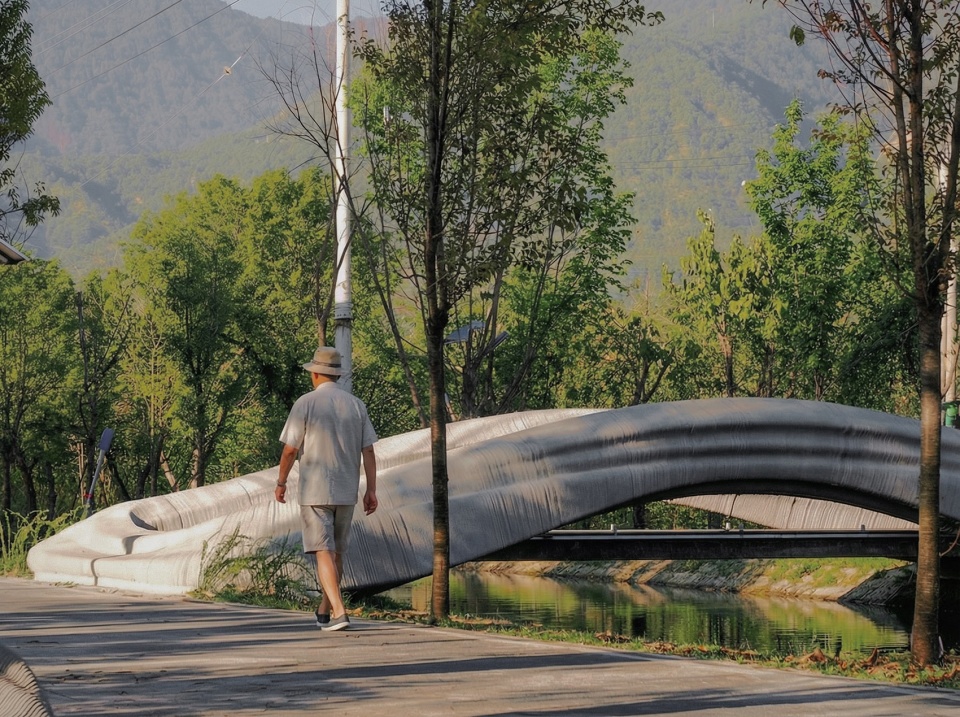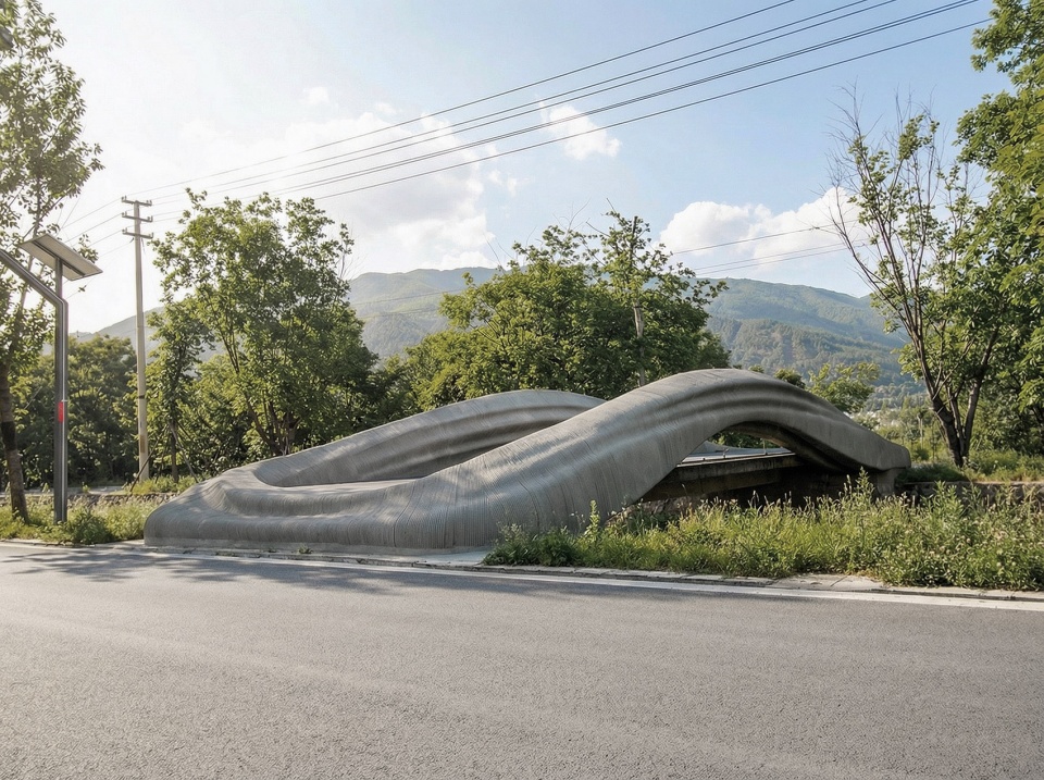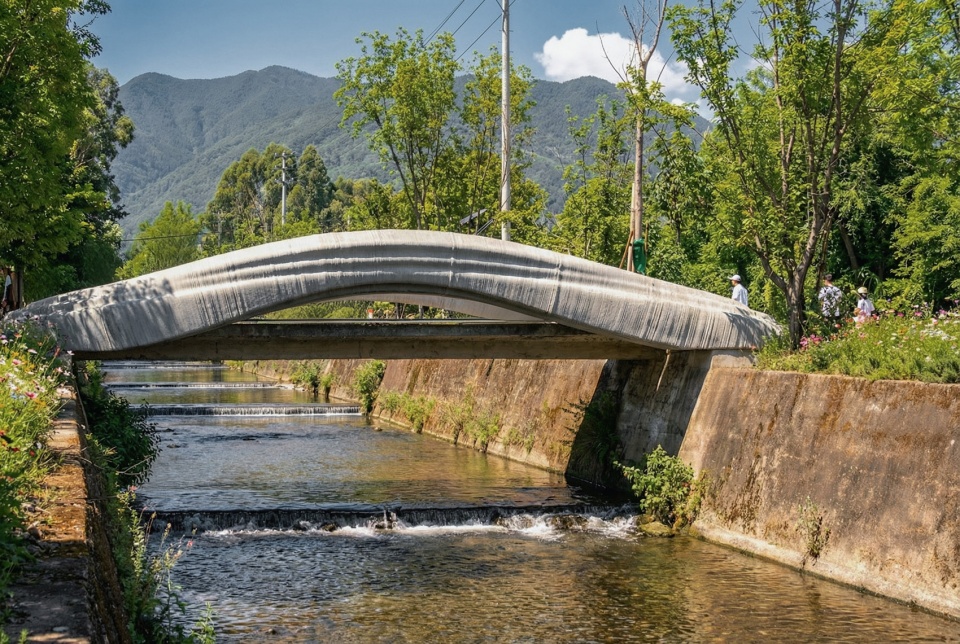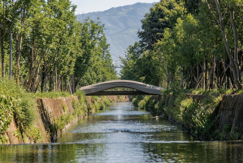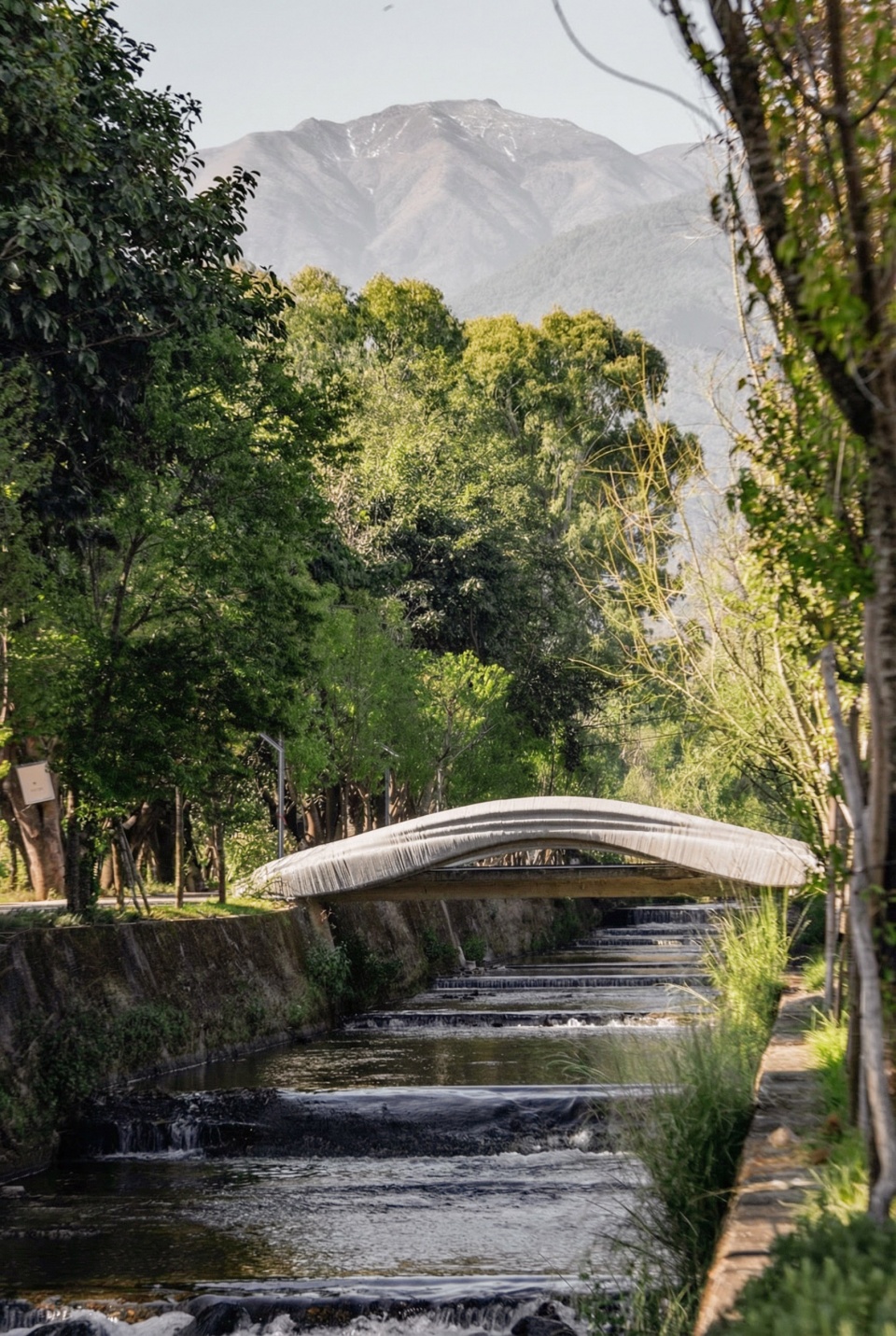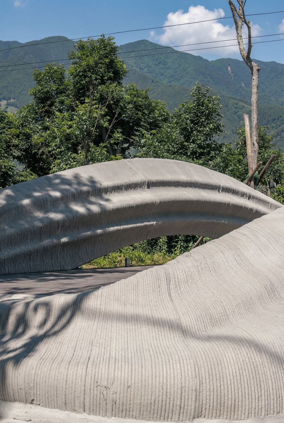 The first modified concrete 3D-printed pedestrian bridge in Yunnan was recently completed on the banks of Wanhua Stream in Xizhou, Dali. Situated at a critical node of the Xizhou Ecological Corridor, the bridge forms part of the local slow-traffic network. The design adopts a lightweight transformation approach while preserving the spatial memory of the original stone slab bridge. Through a distinctive digital concrete architectural language, it integrates ecological concepts with regional culture, allowing cutting-edge technology to permeate the everyday landscape. This project demonstrates a sustainable pathway for digital construction to empower rural contexts.