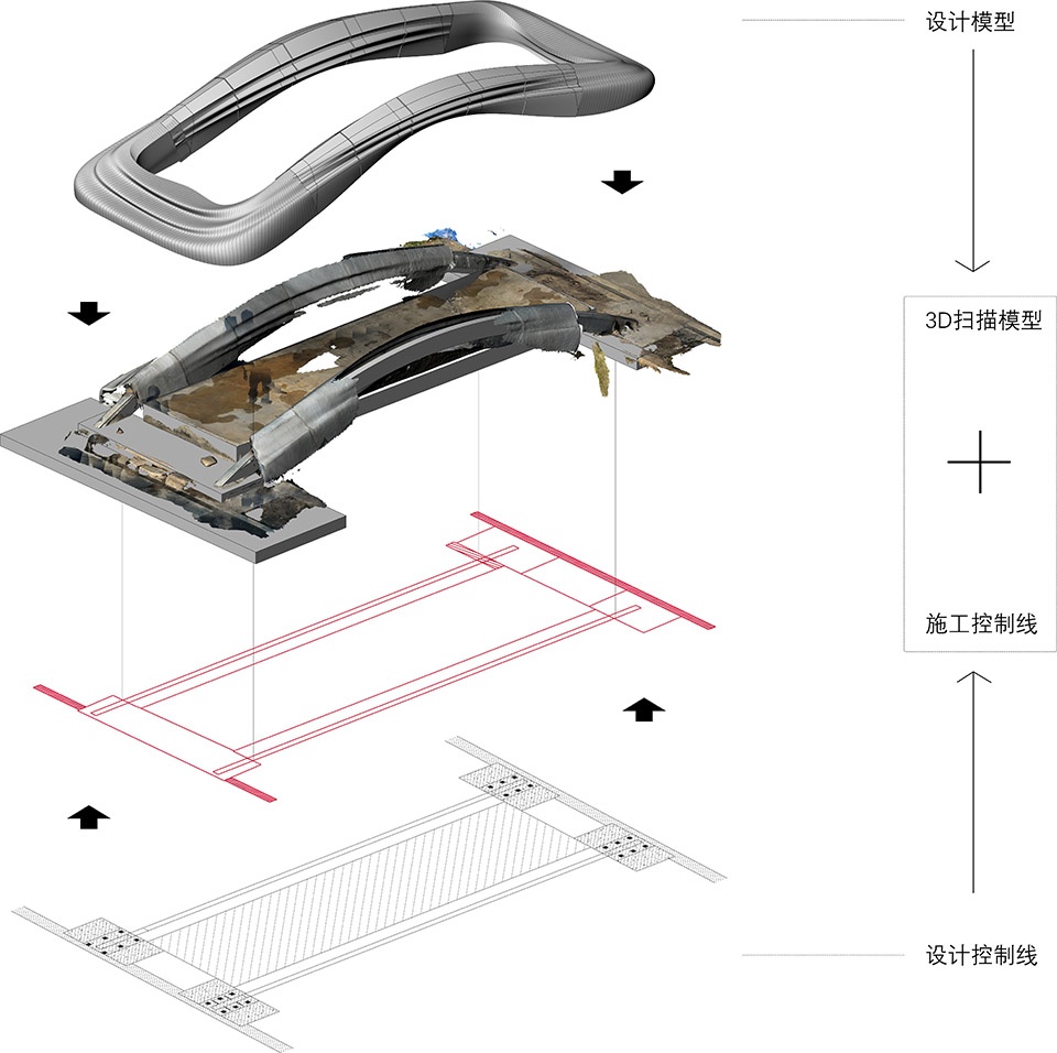 为应对复杂现状,团队引入3D扫描技术对原石板桥进行了高精度的测量,以确保每一块3D混凝土打印模块能在现场准确放置。施工中每出现一处误差都会回传至数字模型进行实时调整,并通过多次三维扫描、模型比对与反馈修正,将误差收敛至现场施工的允许范围内。
