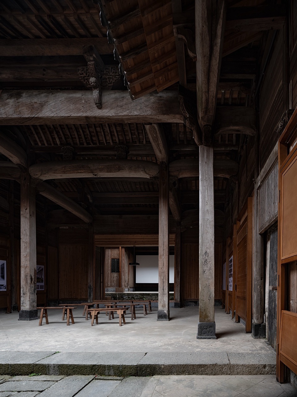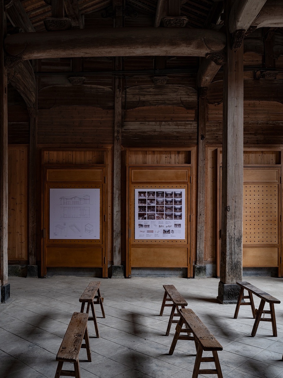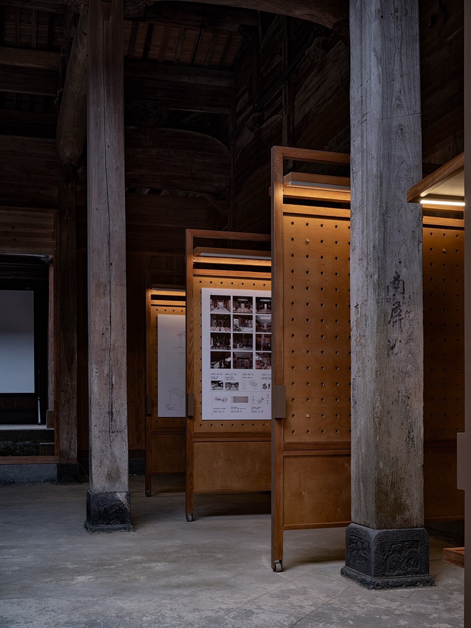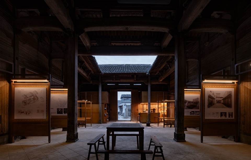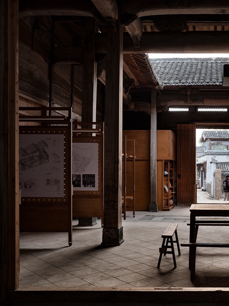 Faced with the rigid constraints of heritage protection, the design strategy adopts an “addition” rather than “subtraction” approach. We introduce an independent secondary structural system, inspired by the wisdom of the “large-scale carpentry” (structural framework) and “small-scale carpentry” (infill and detailing) division of labor in traditional Huizhou architecture. The resulting “Pivoting Panel System” forms the core of the design—it follows the three-bay layout of the ancestral hall, flexibly defining spatial hierarchies from the more public, informal entrance to the core activities in the inner courtyard, all without touching the original walls. It simultaneously addresses practical issues like moisture protection and ventilation for the existing wooden wall cladding.