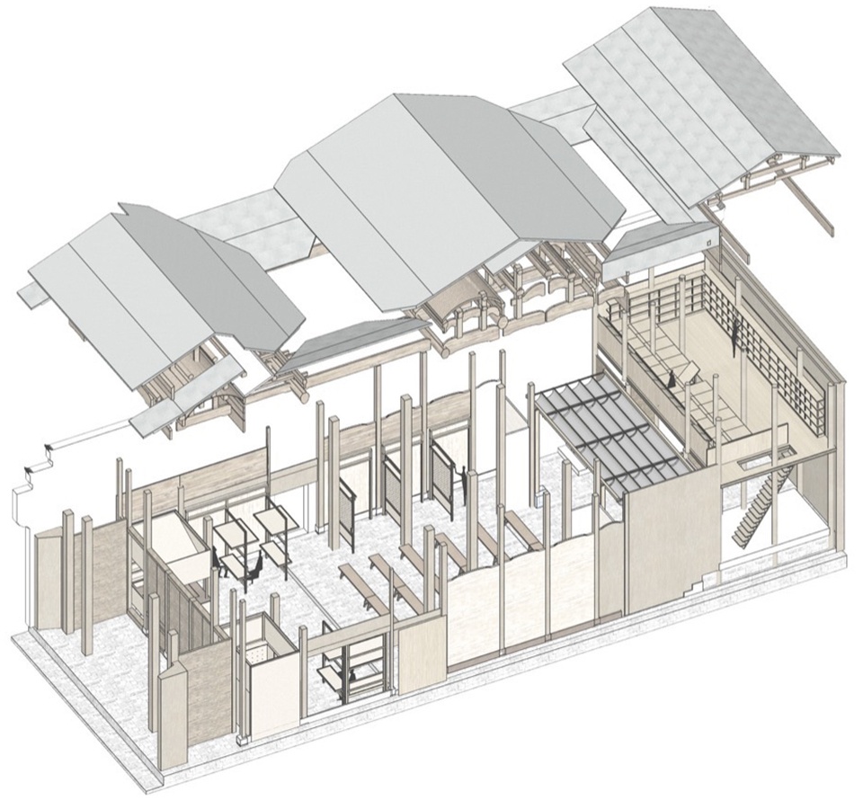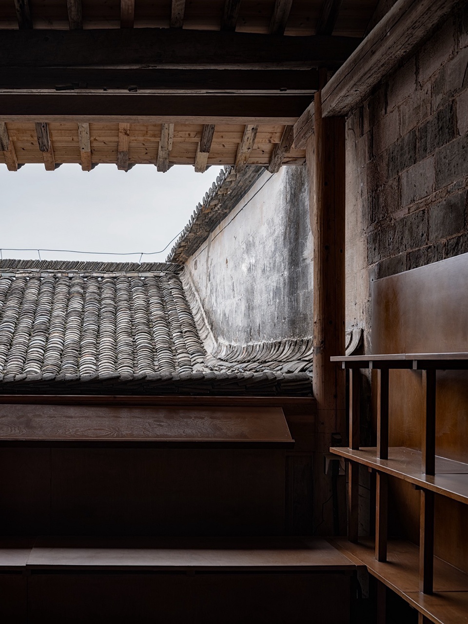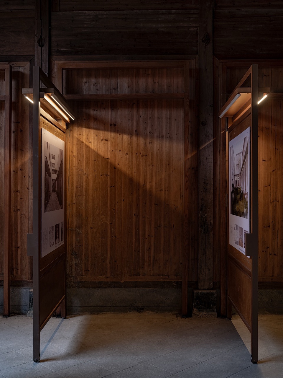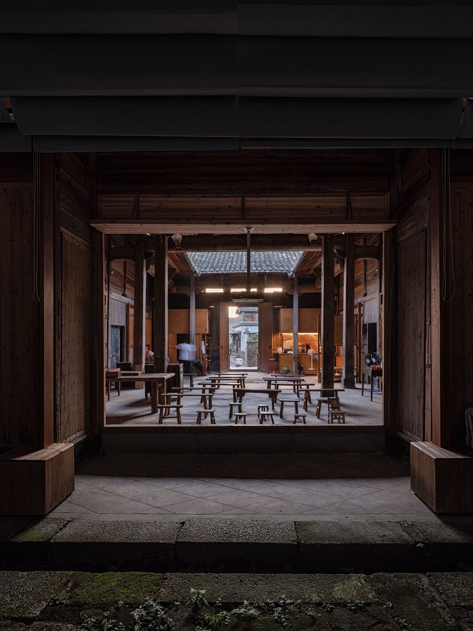 Faced with the rigid constraints of heritage protection, the design strategy adopts an “addition” rather than “subtraction” approach. We introduce an independent secondary structural system, inspired by the wisdom of the “large-scale carpentry” (structural framework) and “small-scale carpentry” (infill and detailing) division of labor in traditional Huizhou architecture. The resulting “Pivoting Panel System” forms the core of the design—it follows the three-bay layout of the ancestral hall, flexibly defining spatial hierarchies from the more public, informal entrance to the core activities in the inner courtyard, all without touching the original walls. It simultaneously addresses practical issues like moisture protection and ventilation for the existing wooden wall cladding.