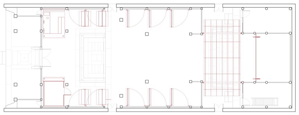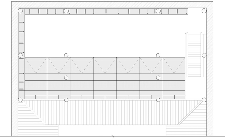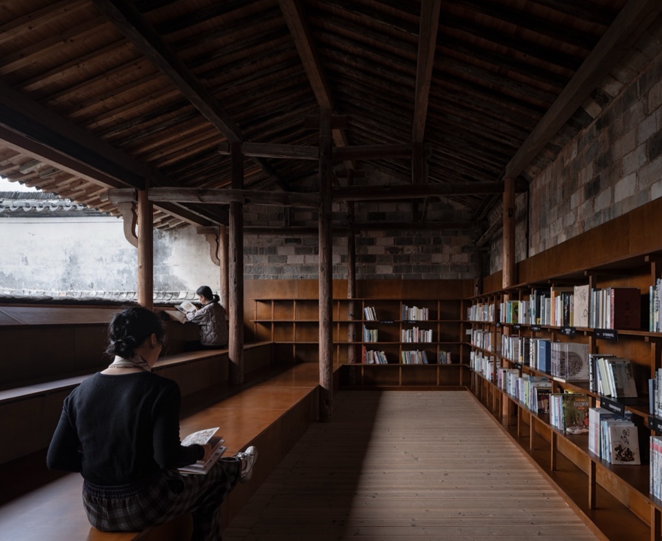 “Film viewing” is central to the spatial experience. Unlike in a conventional cinema, viewing a film in the ancestral hall requires looking through the existing structural framework. The design strategically transforms this into layered viewing experiences: one can either sit and watch from the second bay at eye level or view from a distance across the first-bay courtyard. An operable shading system is installed above the courtyard to enable daytime screenings. The library on the second-floor mezzanine utilizes detachable and modular furniture to cleverly adapt to the existing space’s high windows and scale.