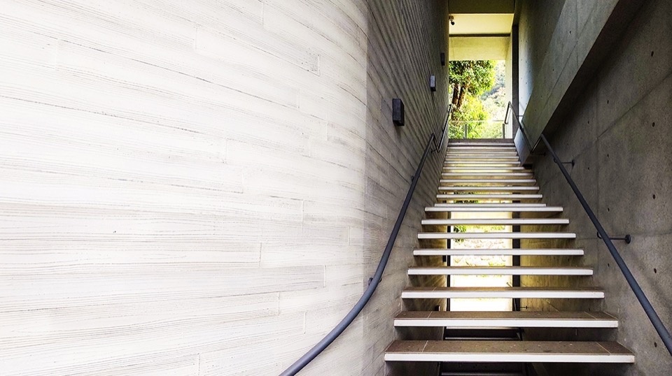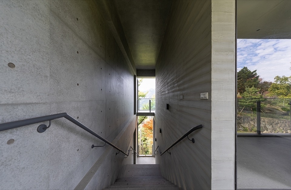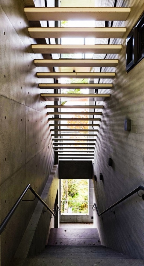 ▼透空楼梯设计也将光影与自然过筛展现特殊框景,The porous steps frame shadows and greenery as one moves, turning circulation into a continuous act of viewing
