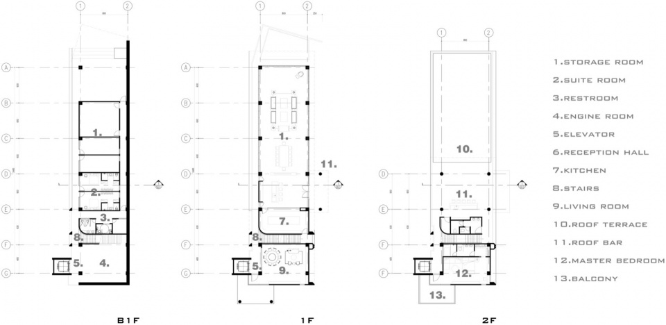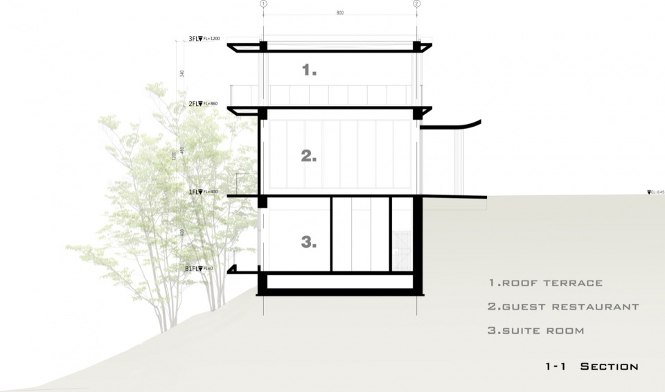 建筑量体垂直规划如下:建筑按垂直顺序组织,每一层都根据其与地形的关系和居民的日常节奏来定义。B1根植:与山坡挡土墙共构,成为稳固的根基。衔接对外动线也存放务农园艺工具与登山装备之用。