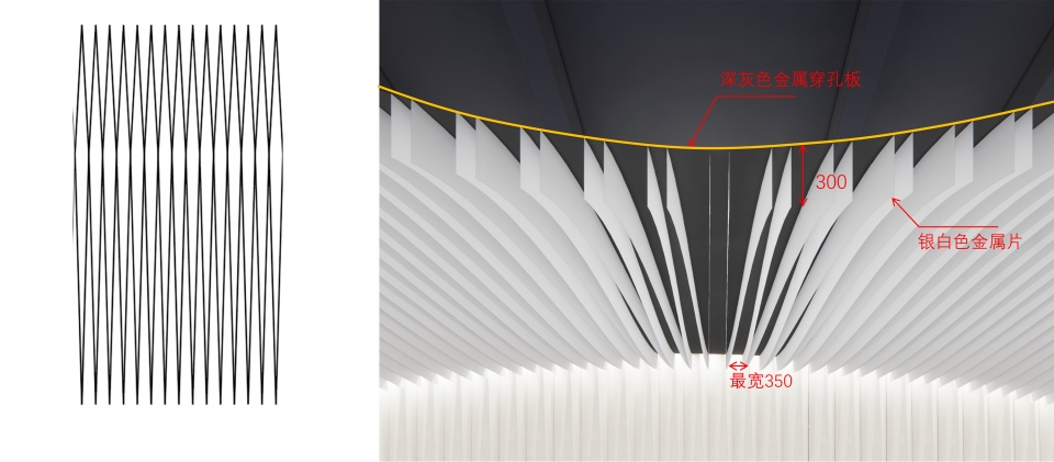在细部层面,流线型金属片以首尾相连的方式呈波浪状展开,构建出动感而连续的空间形态。机电设施如照明、送风口及喷淋装置等均巧妙隐藏于金属片间隙之中。白色灯具与吊顶融为一体,避免视觉突兀;金属线条遵循编织式构造逻辑,曲线背衬深灰色穿孔板,既起到固定作用,又满足排烟通风功能需求,同时有效遮蔽吊顶内部结构与管线系统。