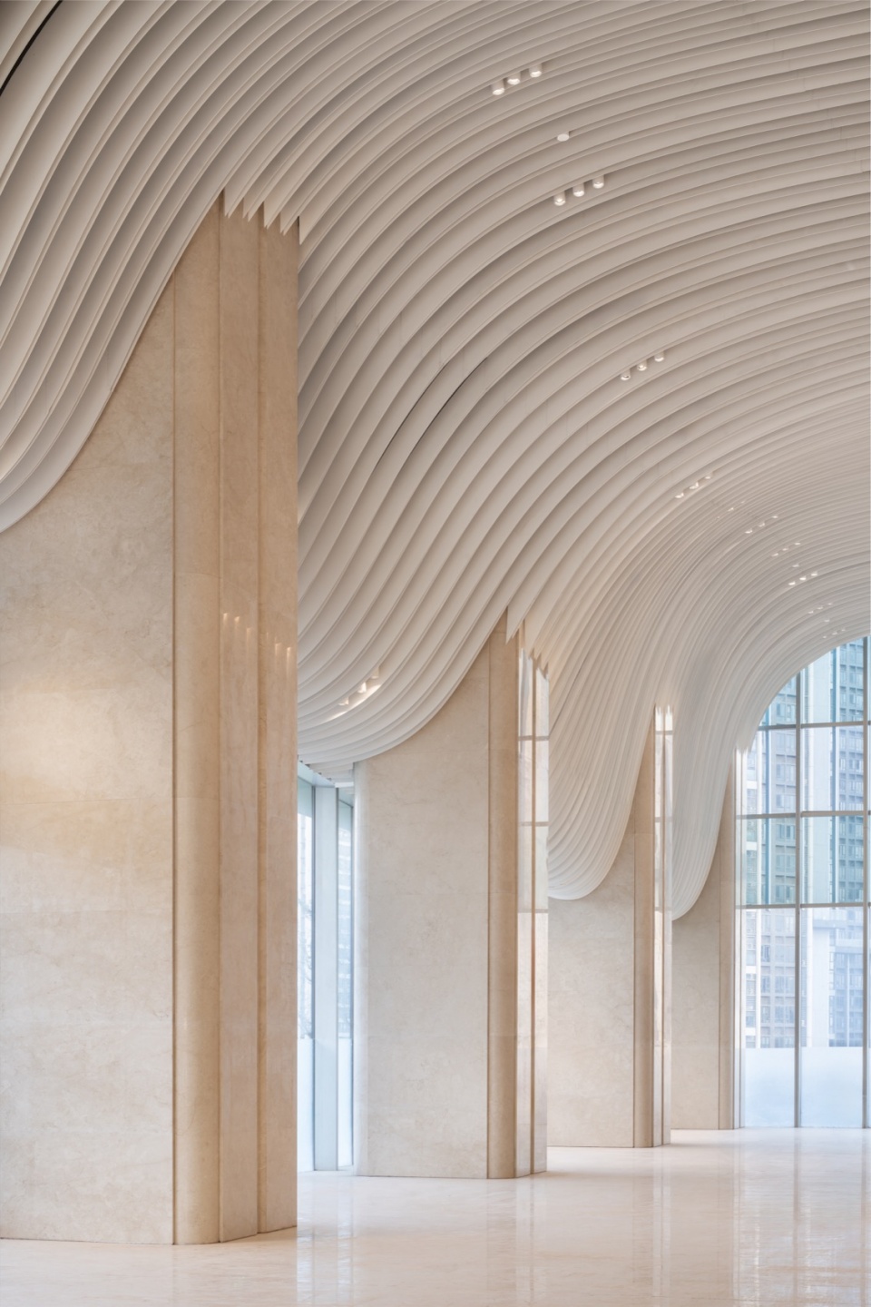 如果说东北塔是沉稳的序曲,东南塔则是激昂的乐章。大堂以“潮涌”为主题,顶面化为一道连续起伏的波浪,充满动势与能量,仿佛将珠江的勃勃生机凝固定格。大堂顶面采用连续起伏的曲线构造,呼应建筑立面与雨棚的线性语言,并通过由低至高的空间引导,将人流自然引入室内。墙面、地面与吊顶在材质与构造上形成连续关系,使室内空间成为建筑表达在内部尺度上的延伸。