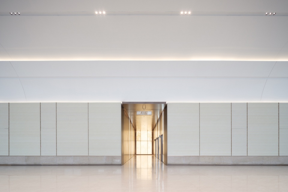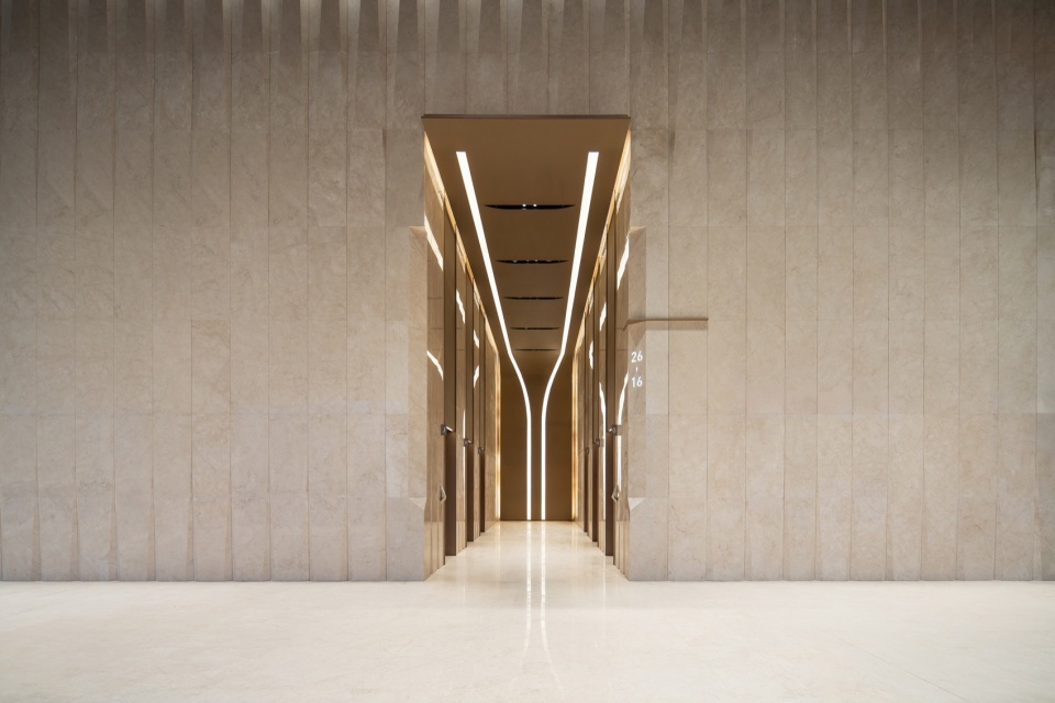 大堂向内展开的空间序列在纵深方向被持续拉伸。弧形顶面与线性灯光共同构成明确的视觉指向,使电梯厅及相关公共区域不再被简单理解为功能性空间,而成为大堂体验的自然延续。