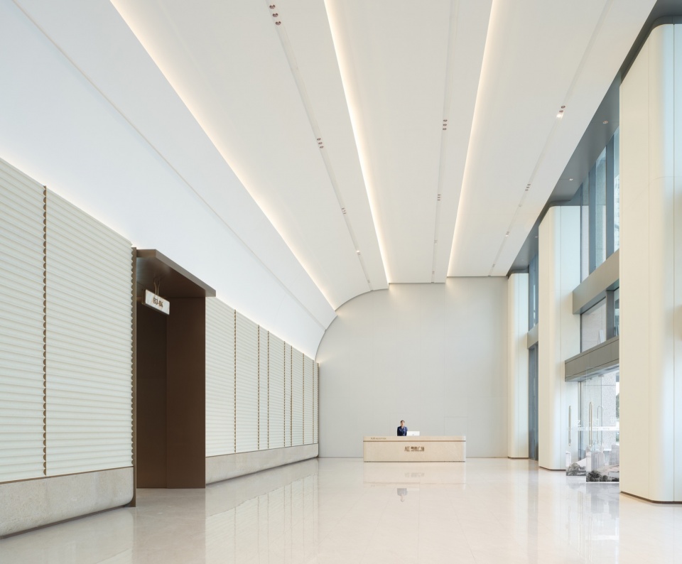 如何让建筑立面上流淌的“水”的意象,与木棉花瓣的形态共鸣,穿越玻璃幕墙,在室内空间中延续、演化,成为人们可感、可知、可停留的体验?东北塔大堂弧形吊顶与建筑雨棚自然衔接,形成一道流畅而有力的视觉引导。通过纵向延伸与轴线强化,将进入后的动线引导转化为清晰而集中的空间体验,自然地把视线引向端头的白云山。结合塔楼立面连续的流线语言,整体空间如水流倾泻般自上而下展开,在秩序与节奏中建立清晰而稳定的公共场所形象。