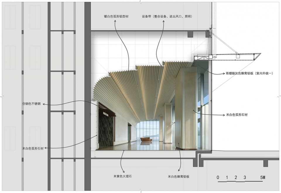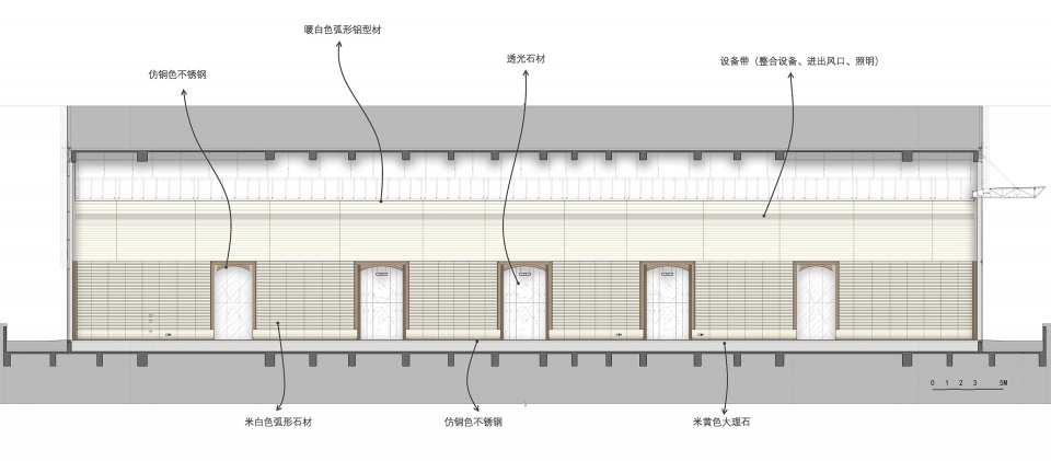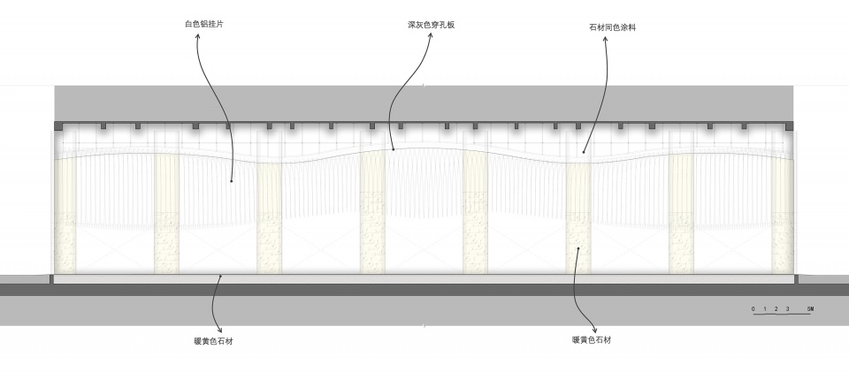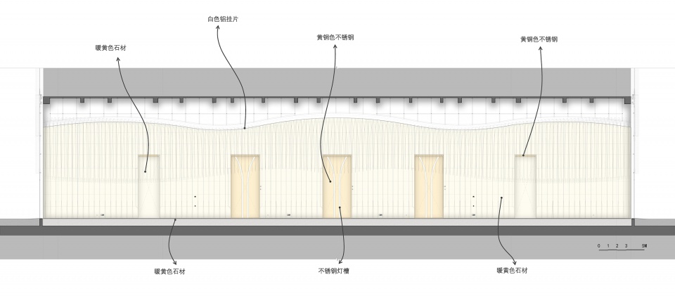 ▼石材的弧形墙面与弧形的吊顶构件形成节奏的变化。The curved stone walls and curved ceiling components create a rhythmic variation.