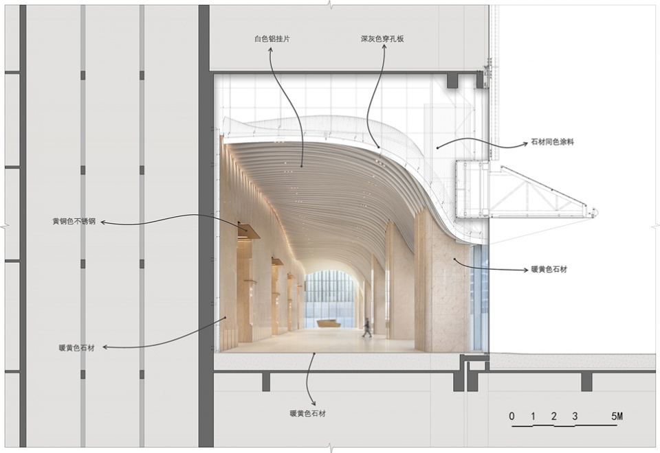▼大堂梯厅铜色弧形金属吊顶,让步入其中的访客仿佛踏上了一辆穿梭时空的列车。The coppertoned curved metal ceiling in the lobby elevator hall creates an experience where visitors feel as if they have boarded a train traveling through time and space.