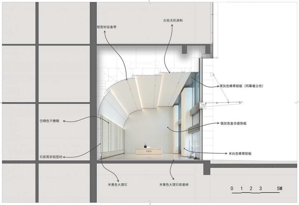 在以建筑与立面逻辑为起点的整体框架下,地面层转换大堂与标准层公共界面承担着将空间语言转译至日常使用层面的角色。设计不再追求形式上的强化,而是通过对材料体系、构造方式与空间秩序的统一控制,使整体概念在不同尺度与使用频率下保持一致的判断。地面层空间延续了四层主大堂的构成逻辑,在保持曲线关系与整体气质的前提下,对材料与做法进行有序简化。Within the overall framework rooted in architectural and facade logic, the Ground Floor Transfer Lobby and the public interfaces of the Typical Floors serve as the bridge that translates the spatial language into the realm of daily use. Instead of pursuing formal exaggeration, the design maintains a consistent aesthetic across varying scales and usage frequencies through the unified control of material systems, construction details, and spatial order. The Ground Floor space continues the compositional logic of the 4th-floor Main Lobby, streamlining materials and construction methods in an orderly manner while preserving the curvilinear relationships and overall temperament.