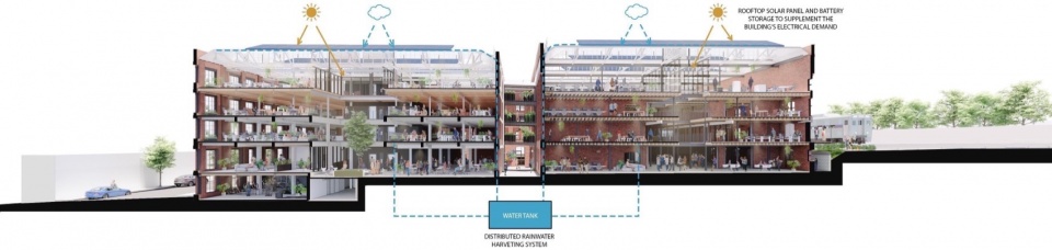 Younghusband项目中对材料的再利用,使其相较于同类参考建筑的隐含碳排放降低了84%(相当于减少11,335,000千克的碳排放)。项目配备了一套330kW的屋顶太阳能系统及电池储能装置,用以补充建筑的用电需求。高效设备使建筑整体能耗降低了 34%,整个街区在运营阶段实现了完全碳中和。项目设置了一座 50kL的雨水收集水箱,用于景观灌溉及卫生间冲洗;配合高效的用水器具,建筑的自来水使用量相较于典型参考建筑减少了25%。