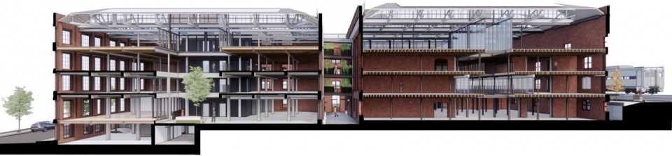 Architects have taken a comprehensively circular approach to construction on the project, adding only what is needed and removing only when absolutely necessary. The majority of existing materials have been retained, with upgrades to the roof, windows, and entries for improved thermal performance. “Waste” materials have been redeployed elsewhere in the build. For instance, removed Douglas fir timber beams have been salvaged during the refurbishment and made into handrail ledges in the public area and link bridges. Timber from the site has been de-nailed and planed by local makers, Timber Trip, and reintegrated into the refurbishment.