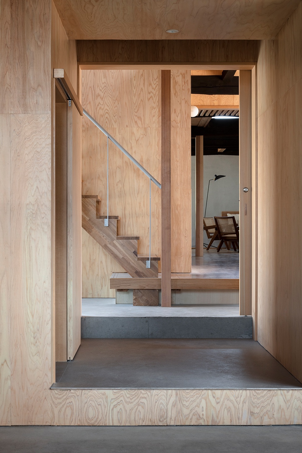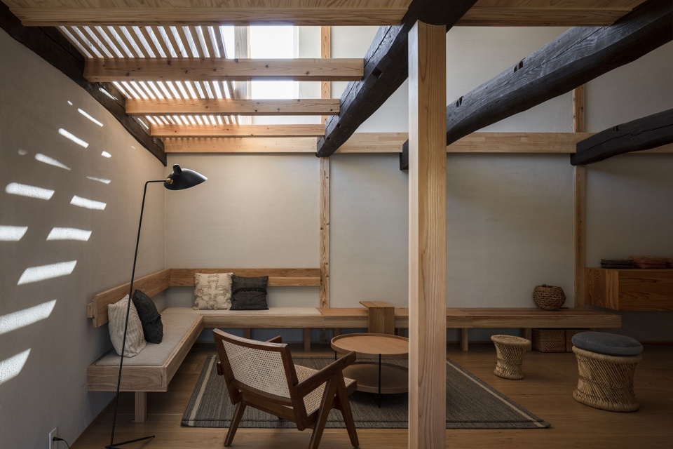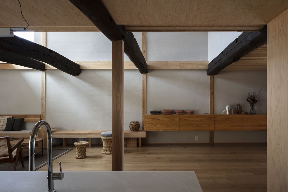 这座曾用作仓库的两层建筑有着四户的立面,并且采用了跨越大跨度的大梁结构。大梁是建筑最具特色的部分,我们考虑在住宅部分的改造中尽可能多地保留它们,作为室内设计元素。入口位于建筑的中央,建筑的一半用于租赁空间(社区空间),另一半作为住宅(样板房),土楼地面将两者分开。每个空间都旨在创造一种节奏感十足的空间体验,土楼地面穿过低顶区域,通向两端的大拱形空间。同时,我们将住宅的新部分设计为与现有粗大梁和木质材料和谐融合,使用强烈纹理的胶合板、大型家具和宽大木地板,以与30厘米的圆木梁相协调。
