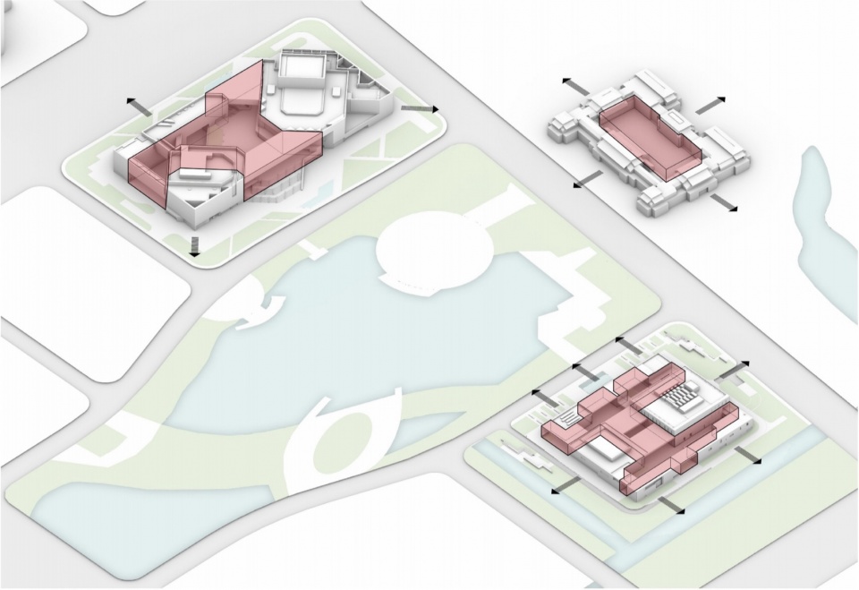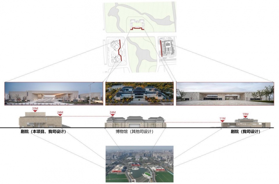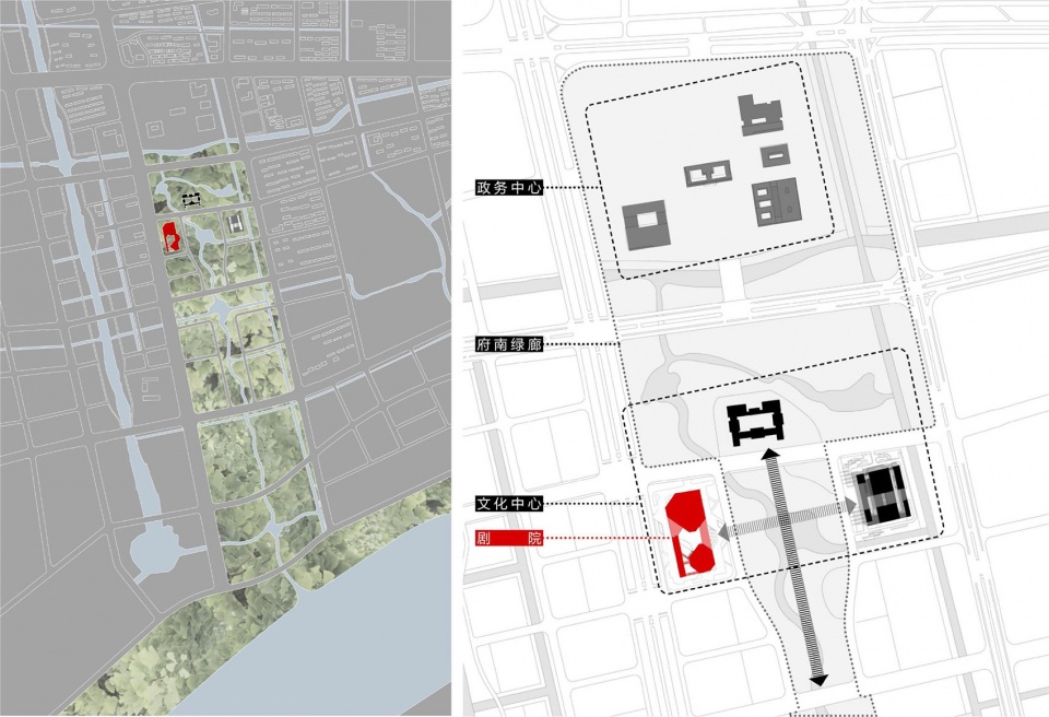 海门市(现已更名为江苏省南通市海门区)文化中心含剧院[1]及图书馆两项目[2] ,剧院位于核心区府南绿廊西侧,与江海博物馆、图书馆共同构成绿廊北区“品”字形公共文化集群。遵循府南片区上位规划,致力于打造“行政、文化、生态”三位一体的整体格局。通过中部打开与图书馆形成的视觉轴线以及压低檐口呈现的水平向韵律,一起营造出和而不同、共融共生的文化中心组群。