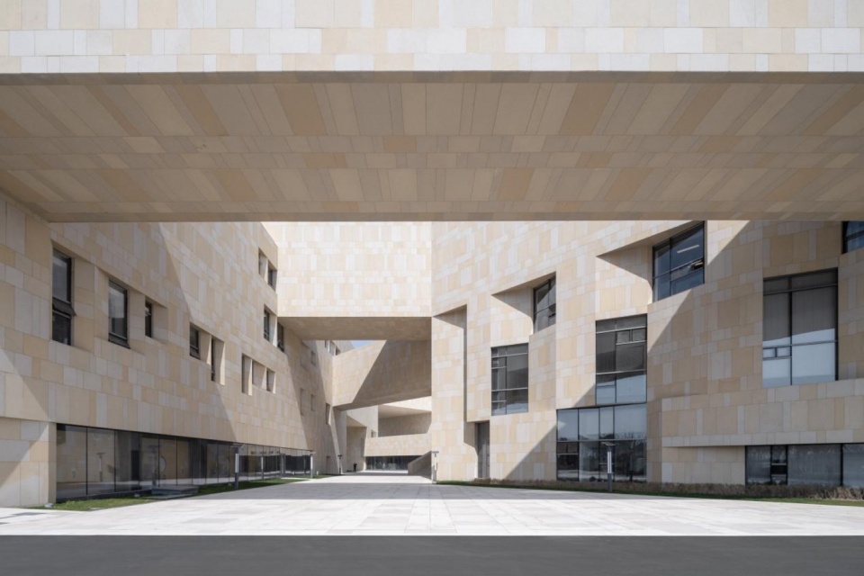 数字技术与地域表达:建筑整体意象取自江海之滨的礁石,充满力量与在地感。外墙采用了参数化设计跳色石材技术,通过精准控制三种暖色石材的尺寸、比例与拼接逻辑,在立面上形成斑驳有致的肌理,抽象再现当地“砺蚜山”景观的嶙峋形态与江海潮汐冲刷的视觉记忆。这一数字建造与地域意象的结合,不仅强化了文化建筑的独特韵味,其丰富肌理在夜景照明下更显生动。
