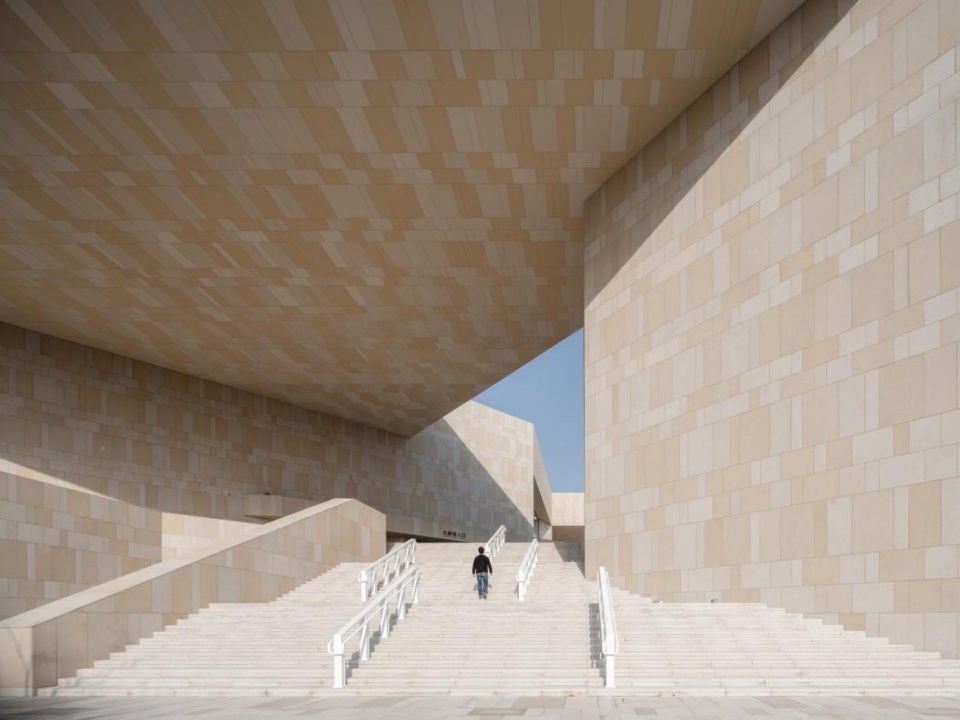 The program comprises four main components: a 1200-seat main theater, a 400-seat multi-purpose public theater, an art troupe area, and associated commercial facilities. Drawing inspiration from the local vernacular “Sitingzhai” (courtyard house) prototype, the design employs a compact, intensive, and zoned courtyard layout that facilitates time-shared operation. Key programmatic elements—the main theater, the small theater, and the troupe spaces—are positioned on the periphery adjacent to the city and park. In contrast, the cinema and commercial spaces, which serve all zones, are located beneath the terraced platform formed by the raked seating of the main theater and the elevated public plaza above. This creates a sequence of compact, intensive, and orderly spatial experiences transitioning from ground level to rooftop. The public can navigate the site unimpeded from all four sides, whether gazing out over the green corridor from the terraces, resting, or entering the building for performances via the light-dappled “lengxiang”^3 and porches. The roof skylight in the theater foyer allows for natural lighting, ventilation, and smoke exhaust. The high-quality execution of the building is furthered by digitally coordinated, color-blocked stone cladding that integrates precisely with the steel structure, and a suspended full-glass curtain wall system.