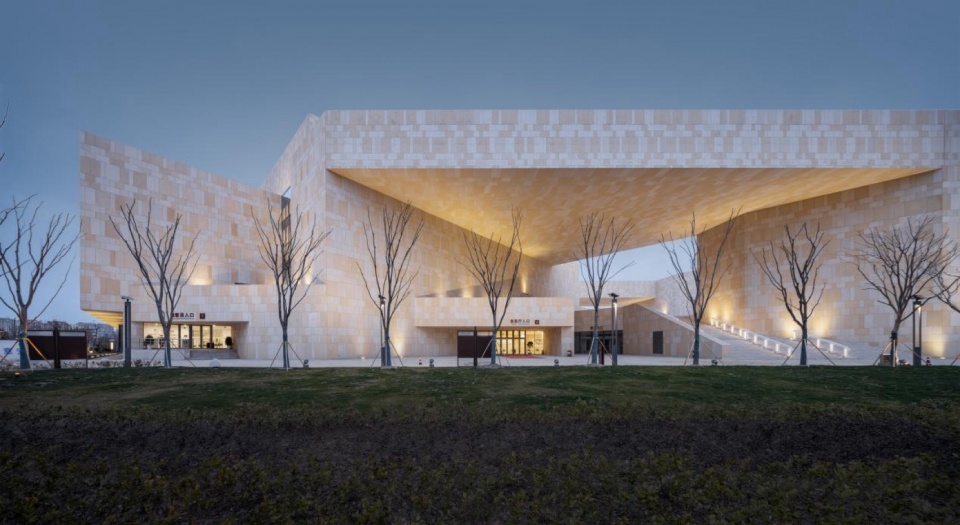 Digital Technology and Regional Expression: The overall architectural imagery draws inspiration from the rocky reefs along the riverside, conveying a sense of tectonic force and site-specificity. The exterior cladding utilizes parametrically designed, variegated stone technology. By precisely controlling the dimensions, proportions, and assembly logic of three warm-toned stone types, a dappled texture is formed on the facade. This technique abstractly reconstructs the craggy morphology of the local “Liya Mountain” landscape and the visual memory of tidal scouring along the river. This integration of digital fabrication and regional imagery not only accentuates the distinctive character of the cultural building but also makes its rich texture appear even more dynamic under nighttime lighting.