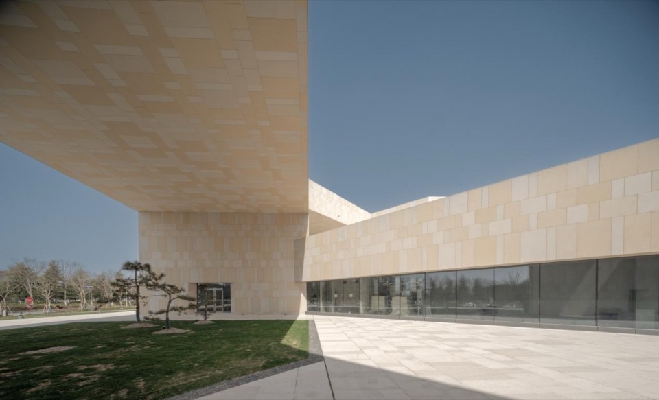 The Haimen Cultural Center (the city of Haimen has since been renamed Haimen District, Nantong City, Jiangsu Province) comprises two projects: a theater[1] and a library[2] The theater is situated west of the Funan Green Corridor core area. Together with the Jianghai Museum and the library, it forms a “pin”-shaped (triangular) public cultural cluster in the northern section of the green corridor. Adhering to the upper-level planning for the Funan district, the project strives to establish an integrated pattern unifying “administration, culture, and ecology.” The visual axis created by opening up the central area towards the library, combined with the horizontal rhythm generated by the lowered eaves, collectively fosters a cultural center complex that embodies harmony in diversity and integrated symbiosis.