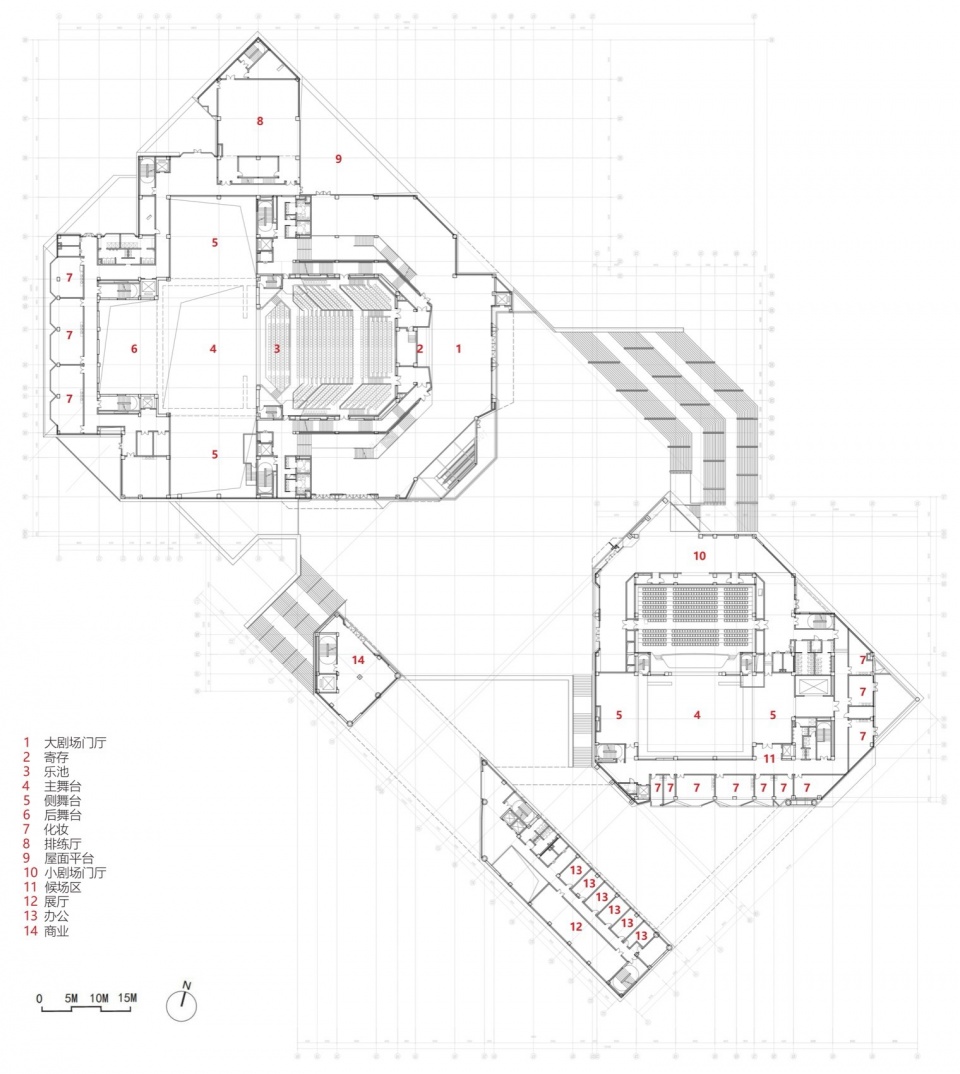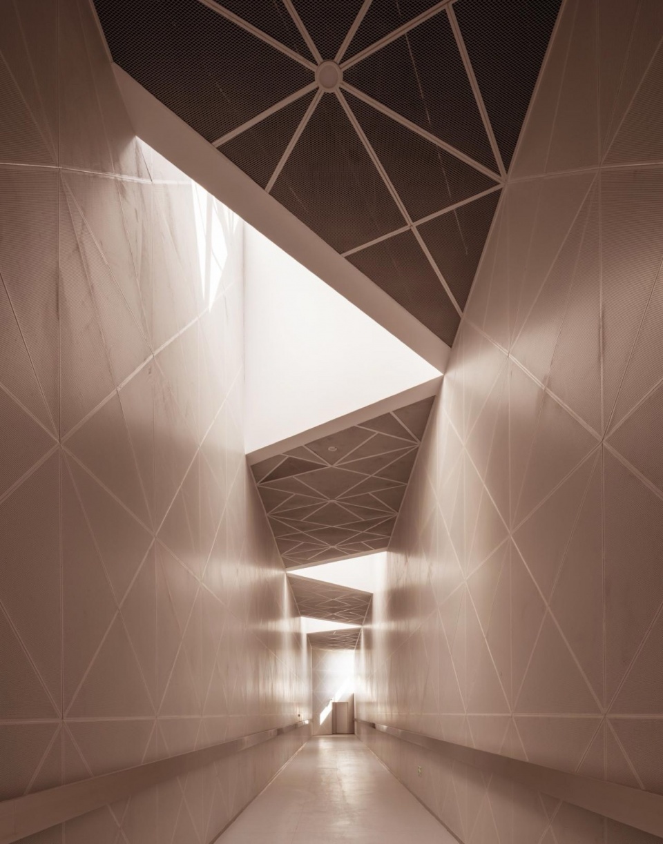 项目包含1200座大剧场、400座多功能百姓剧场、艺术剧团和配套商业四大部分。同样以地方传统民居四汀宅为原型,形成紧凑集约、圈层分区、分时运营的院落式布局:将大剧场、小剧场、剧团等空间布置于靠近城市与公园的外围区域,而将需要服务各区的影城与商业空间布置在大剧场观众厅升起形成的台地和空中广场的下部,构建起从地面至屋面,紧凑、集约、有序的空间场景。公众可无阻碍地四向穿行场地,或于台地上眺望绿廊、坐下游憩,或通过光影斑驳的冷巷与门廊入室观看演出。剧场前厅的屋顶天窗可自然采光、通风与排烟,利用数字工具实现与钢结构精准共构的跳色拼花石材以及吊挂式全玻幕墙系统,共同促成了这座建筑的高品质完成。