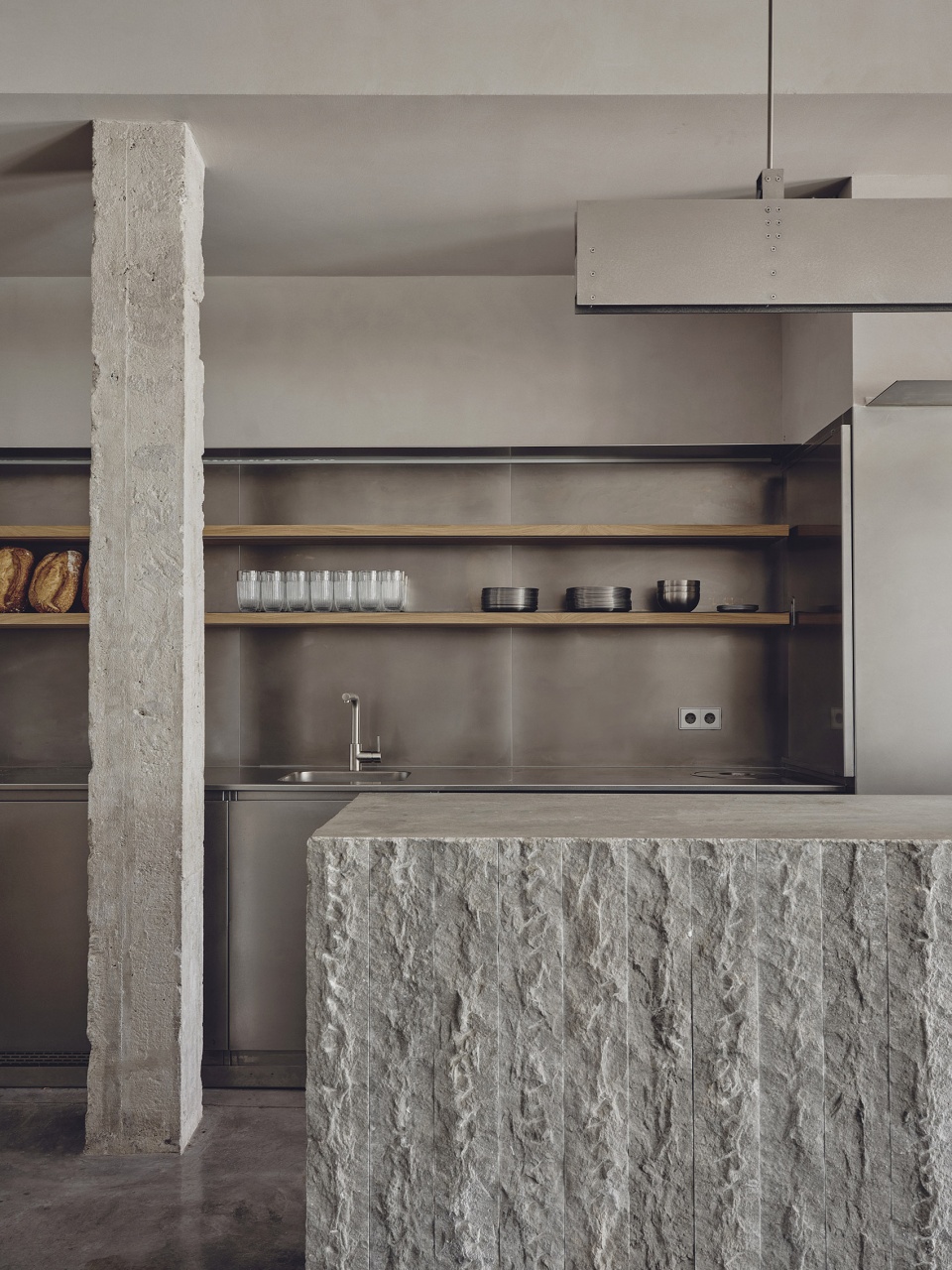 为强化项目的地方身份认同及其与地域之间的联系,设计选用了天然且本地采购的材料。作为这一身份表达的核心与主角,吧台被塑造为一块具有粗野主义气质的坎塔布里亚石材体量——具体为来自Val de San Vicente的劈裂石灰石。