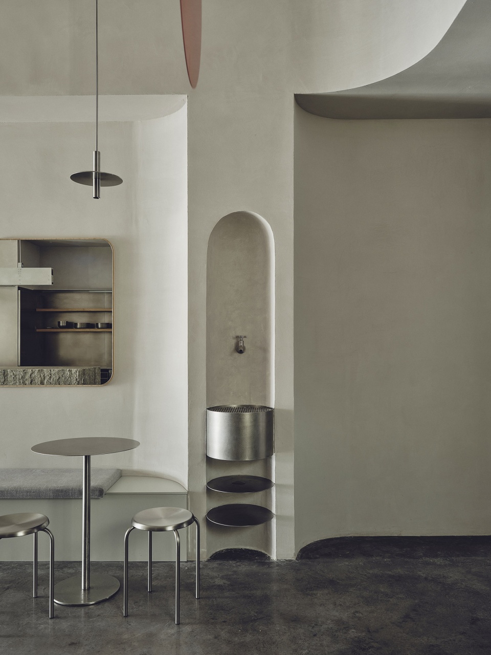 为进一步强化空间个性,设计团队定制了家具与灯具。不锈钢被选为主要材料,象征坚韧与洁净。Atp28与Atp L400两款灯具将装饰艺术与理性主义设计的语汇相结合,并融入现代技术解决方案,为空间体验增添鲜明特质与独特性。光成为空间叙事的重要媒介:它揭示材质肌理,强化曲线形态,并引导访客的行进路径。