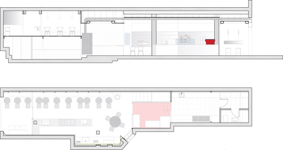本项目以这座建筑独特的建筑个性为出发点:圆柱体量、水平带状线条、舷窗式开窗、红砖以及灰色抹灰表面。这些元素均通过当代建筑语言被延续至室内空间之中。从最初的构想开始,设计目标便十分明确:在场地内部再现西博内大楼的“非典型”气质,在尊重其本质精神的前提下进行再诠释,以满足全新的使用需求。设计策略在于由内向外重释建筑的形式语言,将其形态与质感转译至室内空间之中。