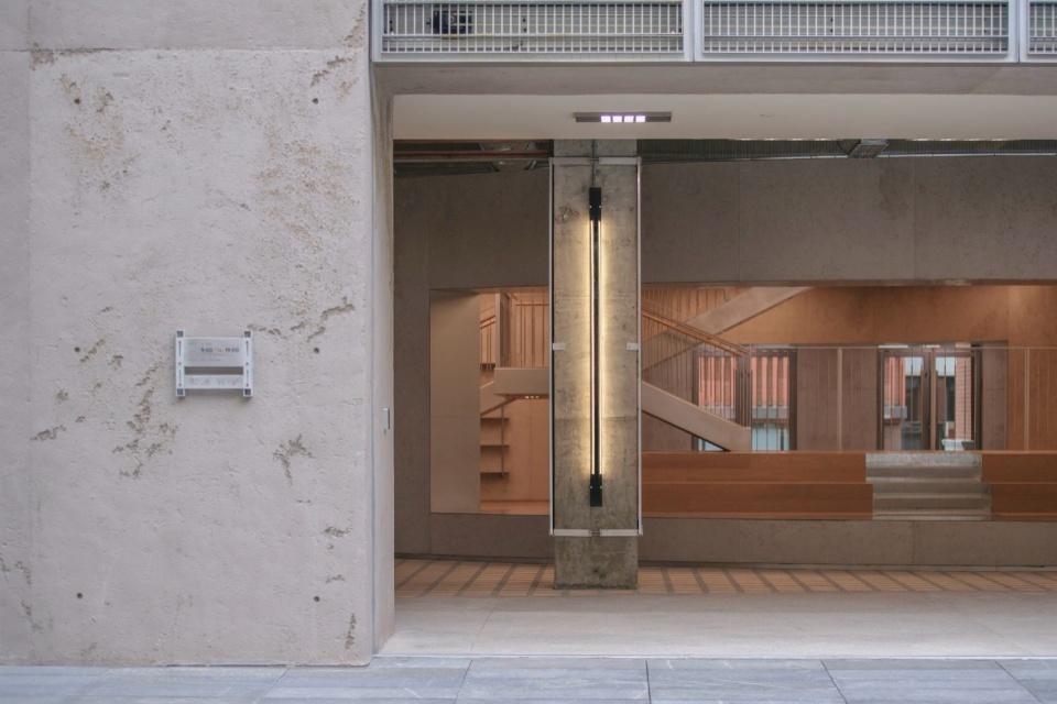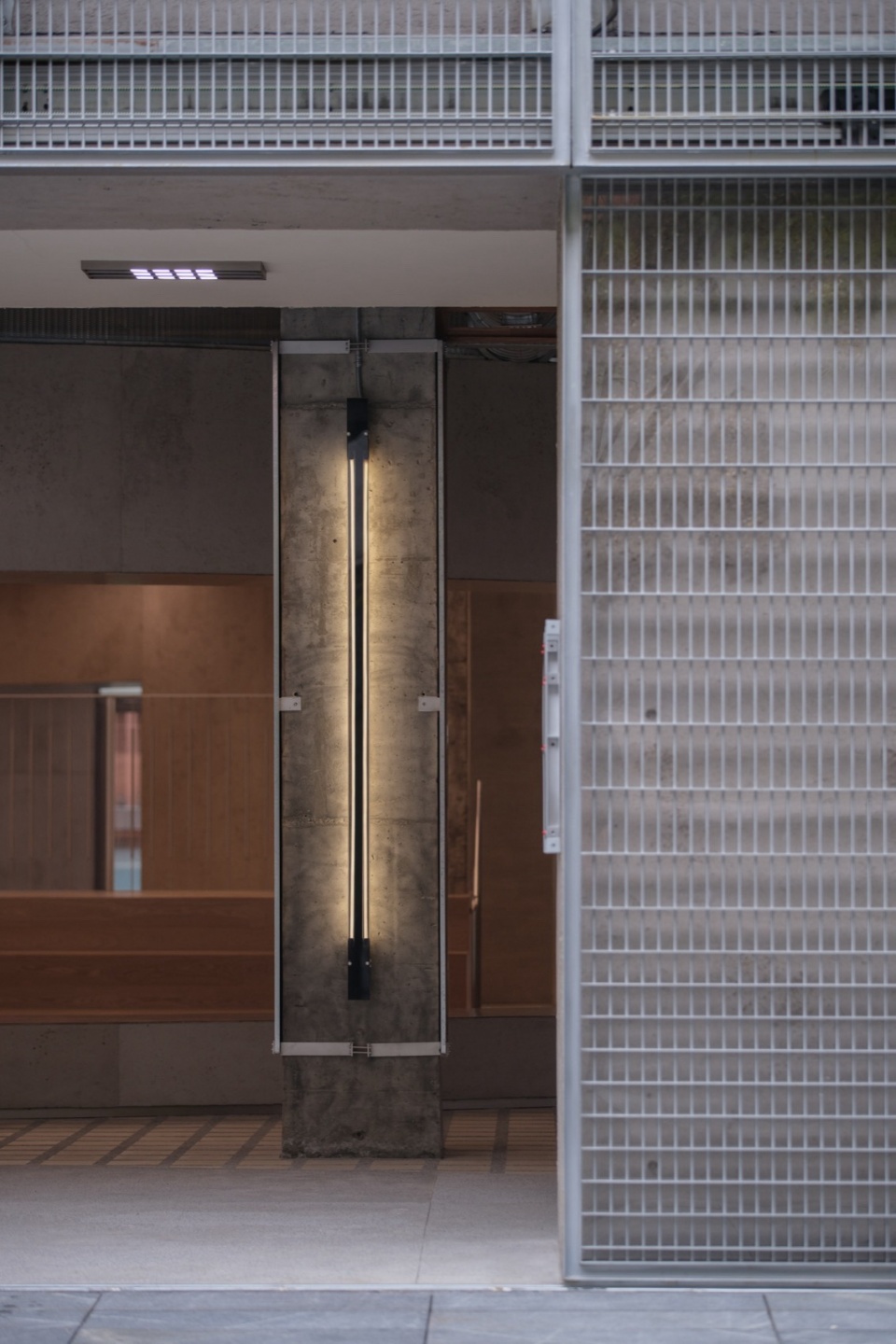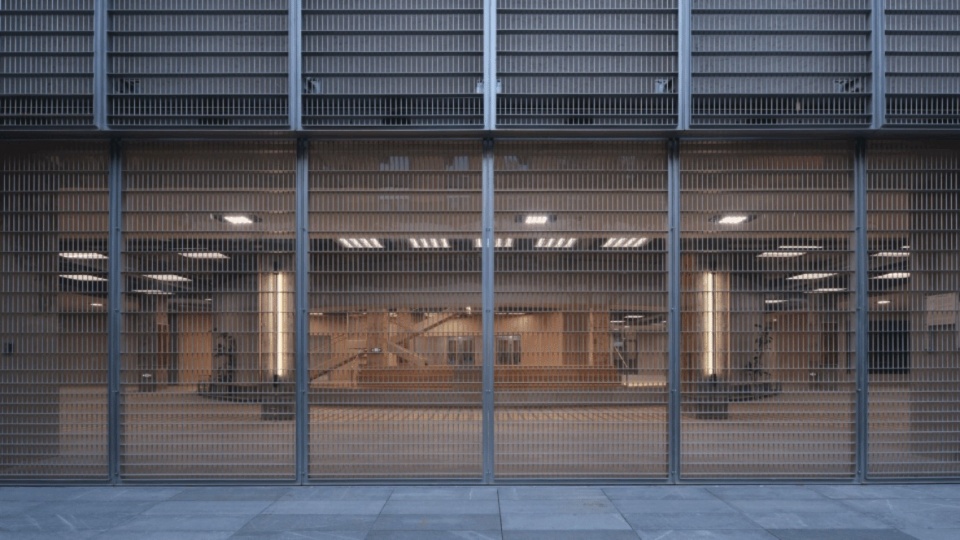 我们以一种先锋性的金属幕帘为建筑开启一层有界的面纱,入口的金属滑门虚实相间,让自然渗透。另一侧,我们为「器空间Organhaus」定制的金属大门,序列的网格规则构成一种机械构造,可折叠开合的入口形式,它延续了Organhaus的艺术实验精神,像嵌在山城的机库大门向艺术家和创作者们开放。