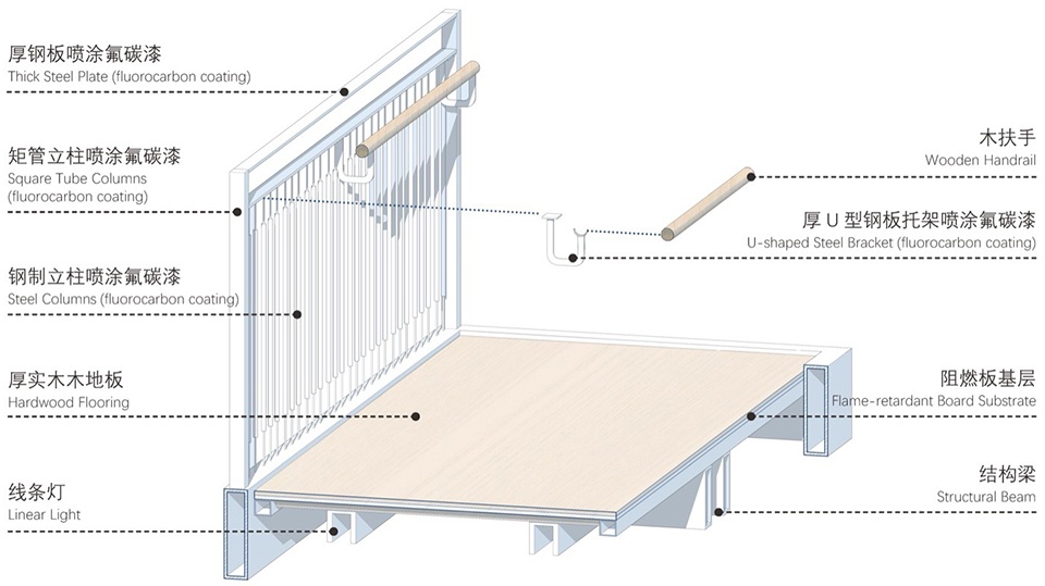 Wood carries the warmth of the Southwest’s local fabric. We wrapped parts of the structure in reclaimed elm boards—here, the expression of “traces” itself becomes an Eastern lyricism.