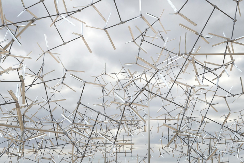 Entirely activated by wind, Fractal Swarm continuously responds to changing atmospheric conditions. Individual elements oscillate, rotate, and tremble autonomously, while the overall form slowly reconfigures itself. From a distance, the collective motion recalls the fleeting formations of bird flocks crossing the sky.