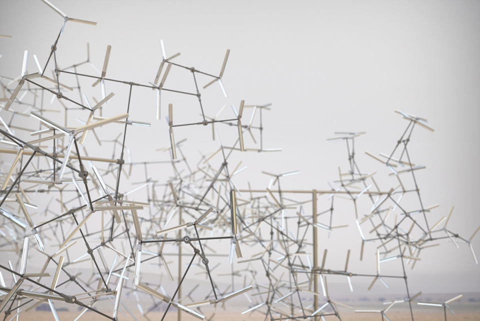 《Fractal Swarm》完全由风力驱动,持续回应不断变化的大气条件。各个单元自主地摆动、旋转与颤动,而整体形态则缓慢地重新组织。从远处观望,群体运动令人联想到飞鸟掠过天空时稍纵即逝的队形。