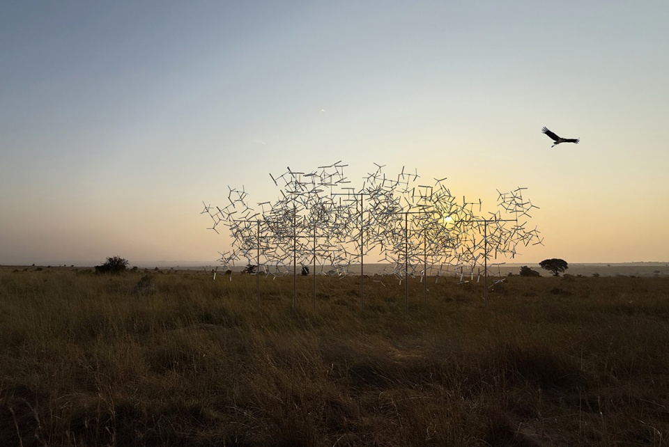 Conceived within the vast openness of the Tanzanian plains, Fractal Swarm is a site-specific kinetic installation by Vincent Leroy. The work establishes a direct dialogue with its surroundings, allowing wind, light, and the horizon to shape its presence in space.