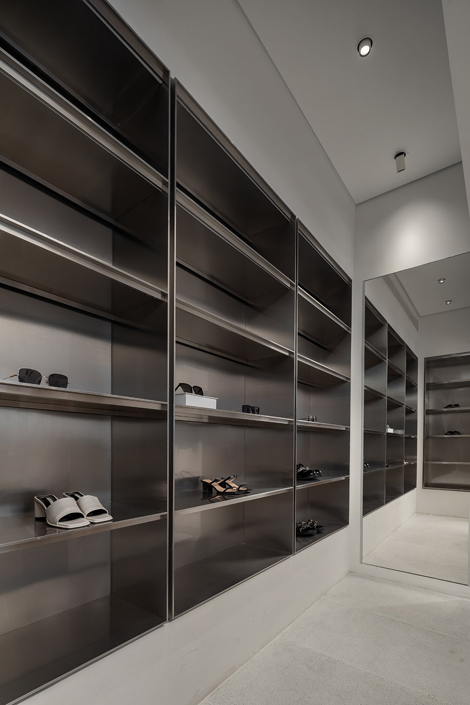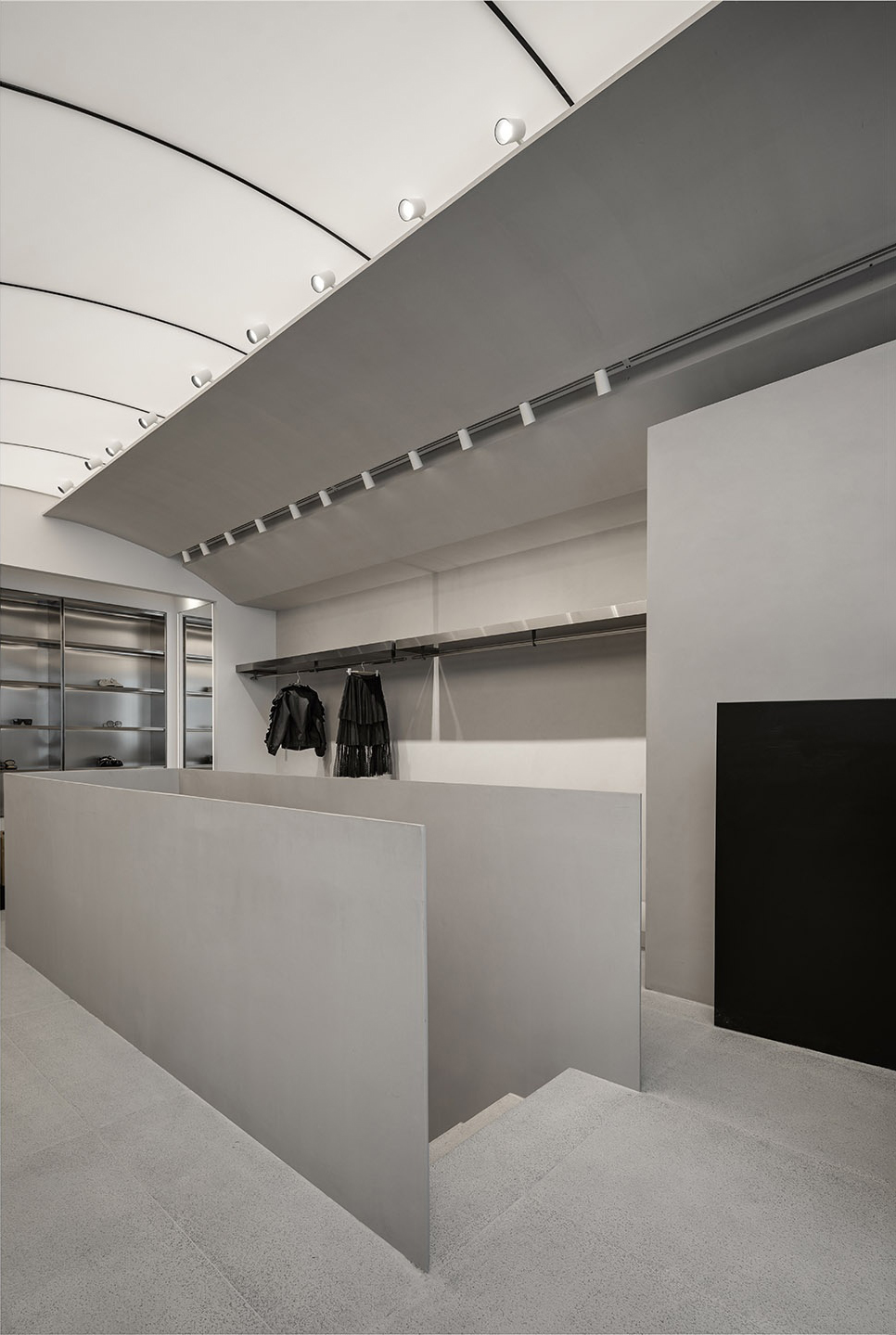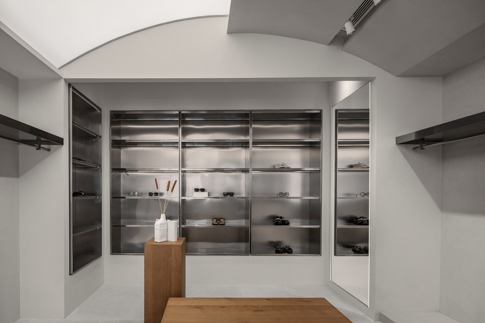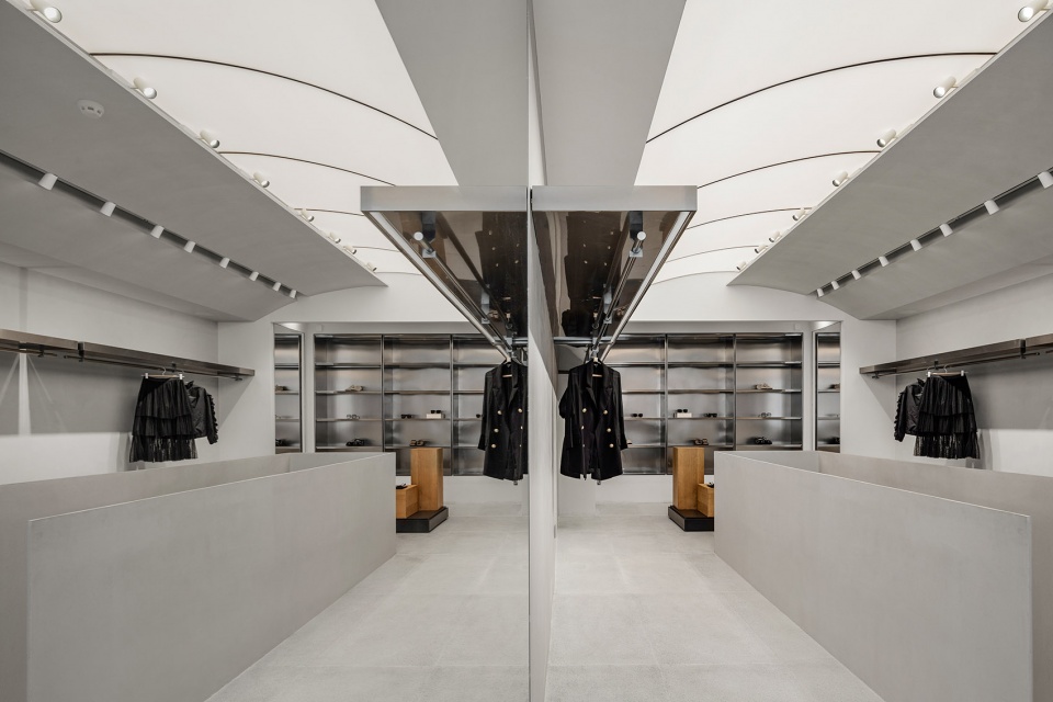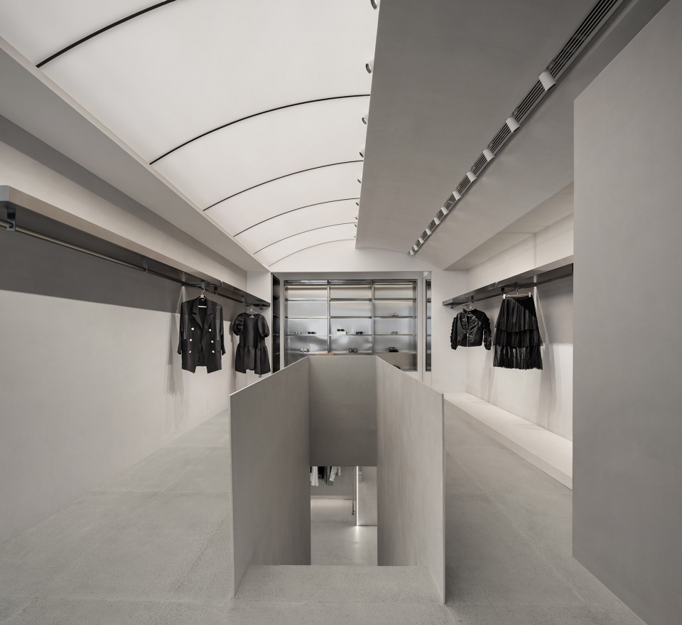 室内对称的层架延伸了顾客的视野,角落隐藏着试衣间;墙面细腻的肌理与地面粗旷的纹路为宁静的空间增添了一丝野性。试衣间外通体镜子和轻柔的绒面布帘,又将整体空间带回宁静。嵌入式照明来加强商店的层次感,灯光衬托出金属的层板,使其质感更加饱满与突出。