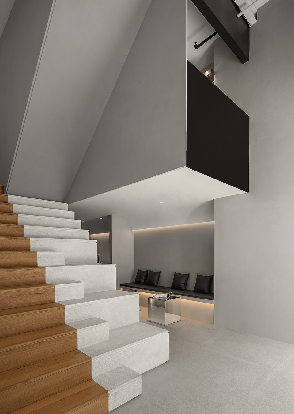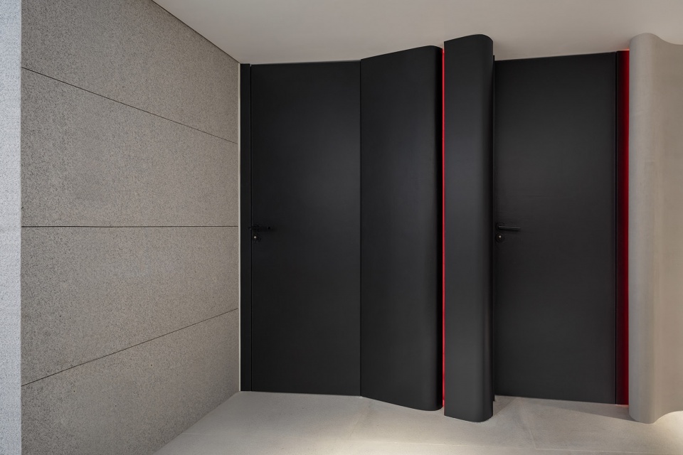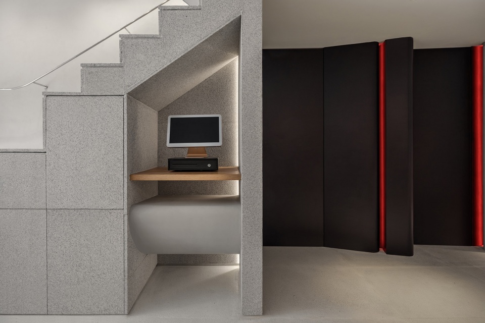 In terms of spatial language, we use pure geometric form to remove the deliberate decoration and shape, so that the space returns to its origin and brings a moment of peace for people who get away from the noise of the city. In the choice of material, gray texture paint and black leather are attached to the interweaving relationship of the body. After the enhancement of color, they suggest movement and ensure the unity of the space.