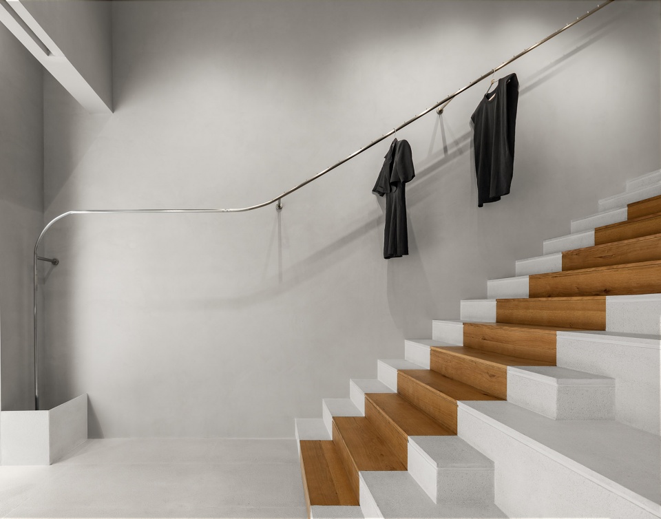 在材质及造型上,为缓解小空间固有的压迫感,使用浅色基调和方正的体块拓展空间界面。单纯的空间与单纯的时间都注定会消散于阴影之中,唯有二者的结合体可以继续保存一个独立的客观事实。三层整体设计并没有拘泥于原始建筑所提供的基础,而是将承载着设计美感的几何比例充分运用在空间中,在不同空间的层叠交错中寻找新的平衡与美感。结合阵列,弧形等多种空间语言,塑造空间多种层次。木质的岛台是空间的又一中心,也是设计中的焦点。设计师静心挑选木纹的天然肌理及质感。这种细致入微的触觉、感官和情感,也提升了室内空间的温度。以微妙的对立关系,用保有美好浪漫的心感受人性和世界,在空间与心灵及服装之间构建链接,是对于品牌精神的延续。