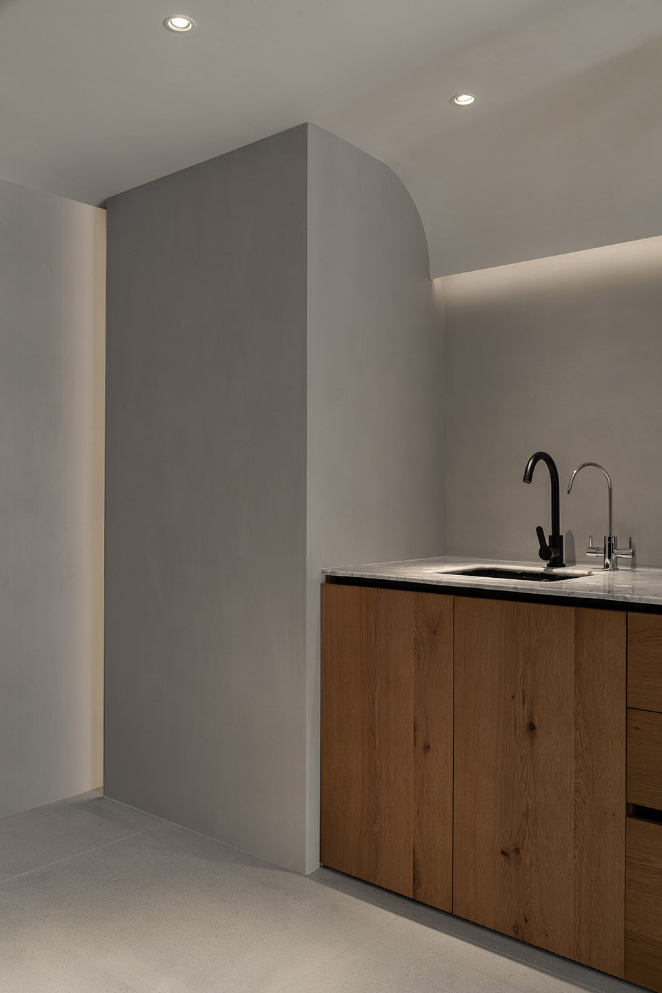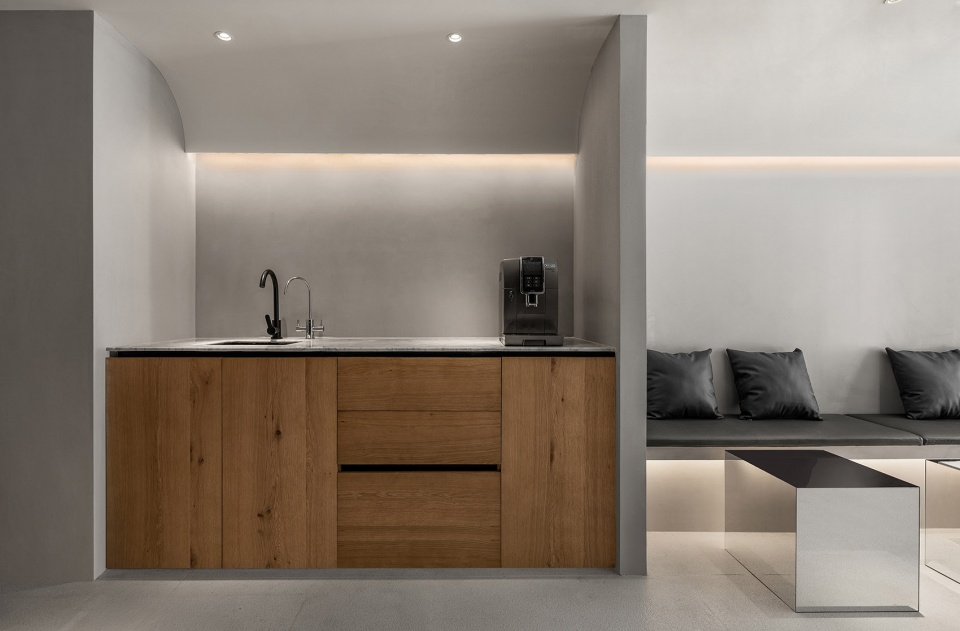 我们要做一个空间,一种气质或者一种境界,能够将空间本身与空间主人联系在一起。整个空间以浅色为基调,表达一种空的空间,我可以把任何一个空的空间,当作空的舞台。众人都有表演欲,好的空间应该让人变成舞者,同时也是观众。你在那里展现的同时,你也看着其他人展示。大面的灰色以混凝土肌理呈现,富有细节的同时保证整体色调的纯净。色调的纯净和几何形体的纯粹相结合,世俗的繁杂被完全去除,让人们放慢节奏,平静内心。