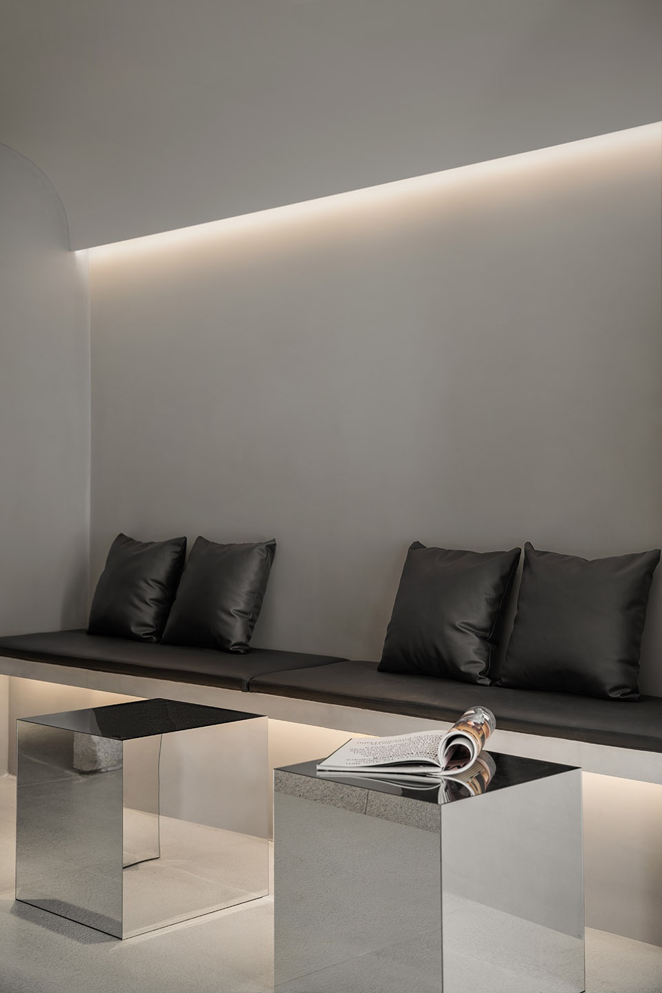 The straight line and arc, two well-organized solid blocks and sensual curved surface form, attempt to describe the spatial representation, and at the same time simplify the complexity of the internal structure and equipment of the space, presenting in the space with a kind of eye-grabbing minimalist modeling. Meditate on this, everything seems to be calm but it contains a mysterious power. The light gradually turns on, and the color and texture of the material changes to reflect the most real self-emotion. In the amplified personal emotion, people will re-examine their inner and surrounding environment and summon up the courage to pursue the voice of their own soul.