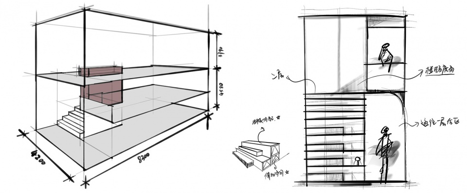 项目的一层径深8.9米,宽度4.2米,层高4.6米,规模稍小、狭长。作为我们此次改造的重点,如何合理的规划功能区,如何利用建筑的优势来增加空间感受,成为了我们主要的设计重点。为了避免做出狭窄简陋的空间,我们的策略就是通过让人在其中不断运动和观看,打造出丰富的层次与深度,从视觉上加强室内空间的建筑感。对照着空旷的原始结构,我们没有用过多的结构语言去修饰空间结构,在平面与立面中,我们用四条直线加一个区域规划出了空间的基础走向。