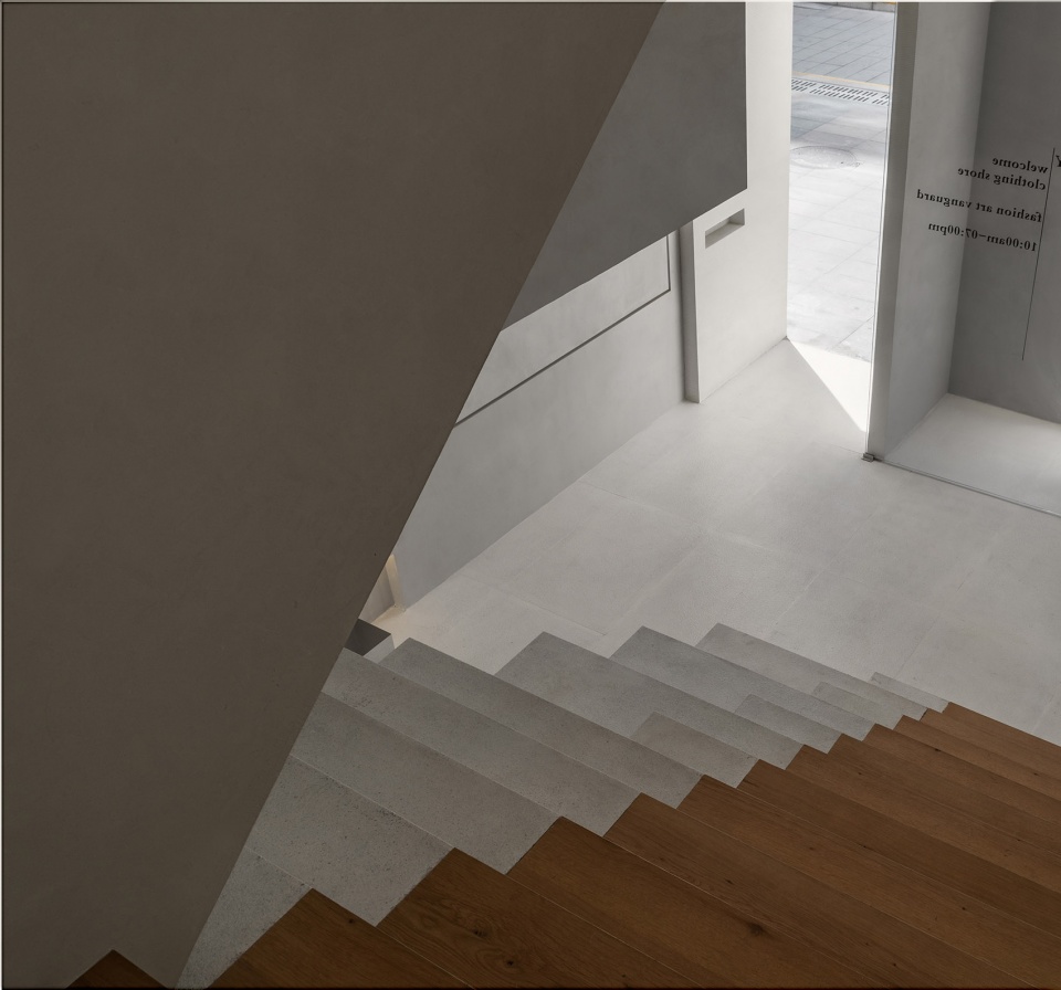 In terms of material and shape, in order to relieve the inherent sense of oppression in small space, light tone and square block are used to expand the space interface. Pure space and pure time are doomed to dissipate in the shadows, and only the combination of the two can continue to preserve an independent objective fact. The overall design of the three floors does not stick to the foundation provided by the original building, but makes full use of the geometric proportion carrying the design beauty in the space, and seeks for new balance and beauty in the overlapping and interlocking of different Spaces. Combine array, arc and other spatial languages to shape a variety of spatial levels. The wooden island is the center of the space and the focal point of the design. Designers carefully select the natural texture and texture of wood grain. This tactile, sensual and emotional nuance also elevates the temperature of the interior space. It is a continuation of the brand spirit to feel humanity and the world with a beautiful and romantic heart through subtle antagonistic relations, and to build links between space, soul and clothing.