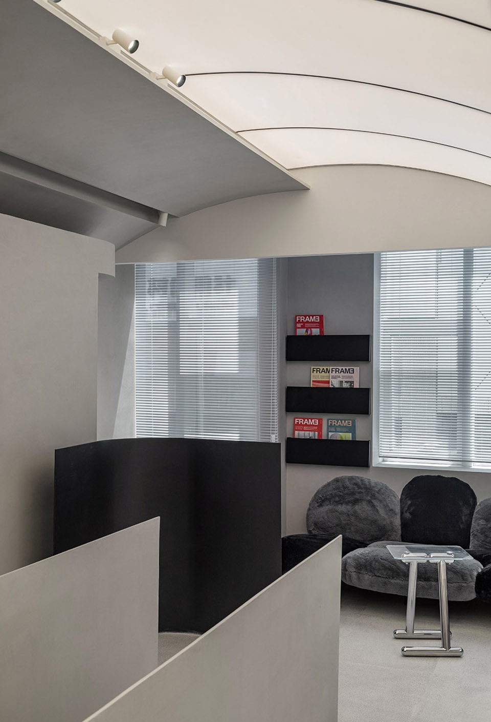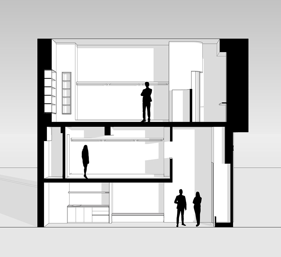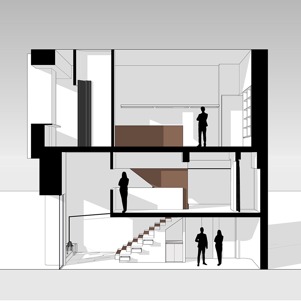 The competition between granite and latex paint highlights the sense of conflict of spatial elements layer by layer through the combination relationship and combination form of materials in space. Meanwhile, the differentiation of the two main spatial forms is deliberately made to convey the conflict and integration between rational logic and perceptual changes. In order to make the space open and transparent to the street, we hide the door frames, tracks and so on to the maximum extent, so as to provide almost undisturbed interior effect for the perspective of the street. At the same time, the living scenes of the street are incorporated into the space and become the content of dynamic exhibition. Take comfort in the noise. That’s our definition of this space. Life and growth, creation and fulfillment will be in it.