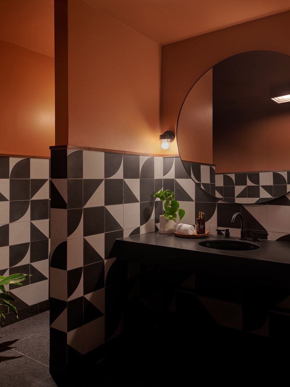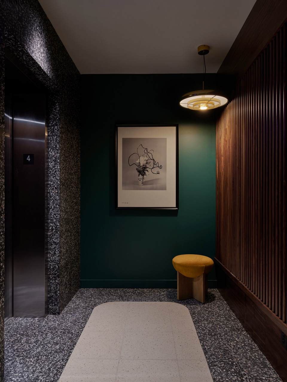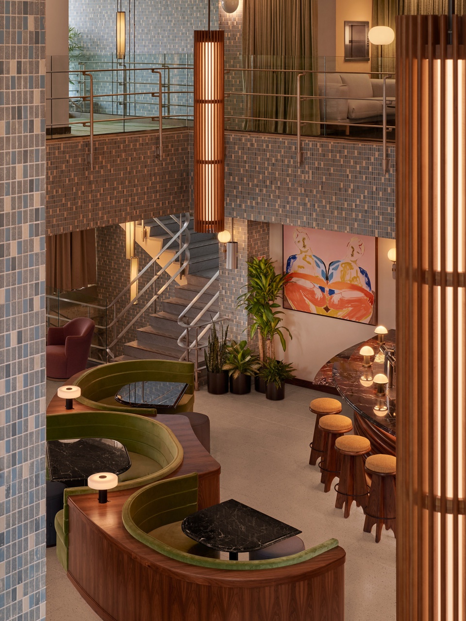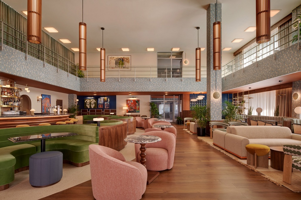 酒店的公共空间呈现出AAmp对于“热带现代主义”(tropical modernism)的诠释。大堂设有双层挑高的休息区,提供多样化座椅选择,并保留修复了原有2×2网格灯具。大堂中的Municipal Bar以半圆形构成视觉焦点,提供精酿鸡尾酒及全天候菜单。酒店背后的品牌Midnight Auteur强调全天开放的大堂酒吧作为核心社交空间,营造充满活力与庆祝氛围的环境。