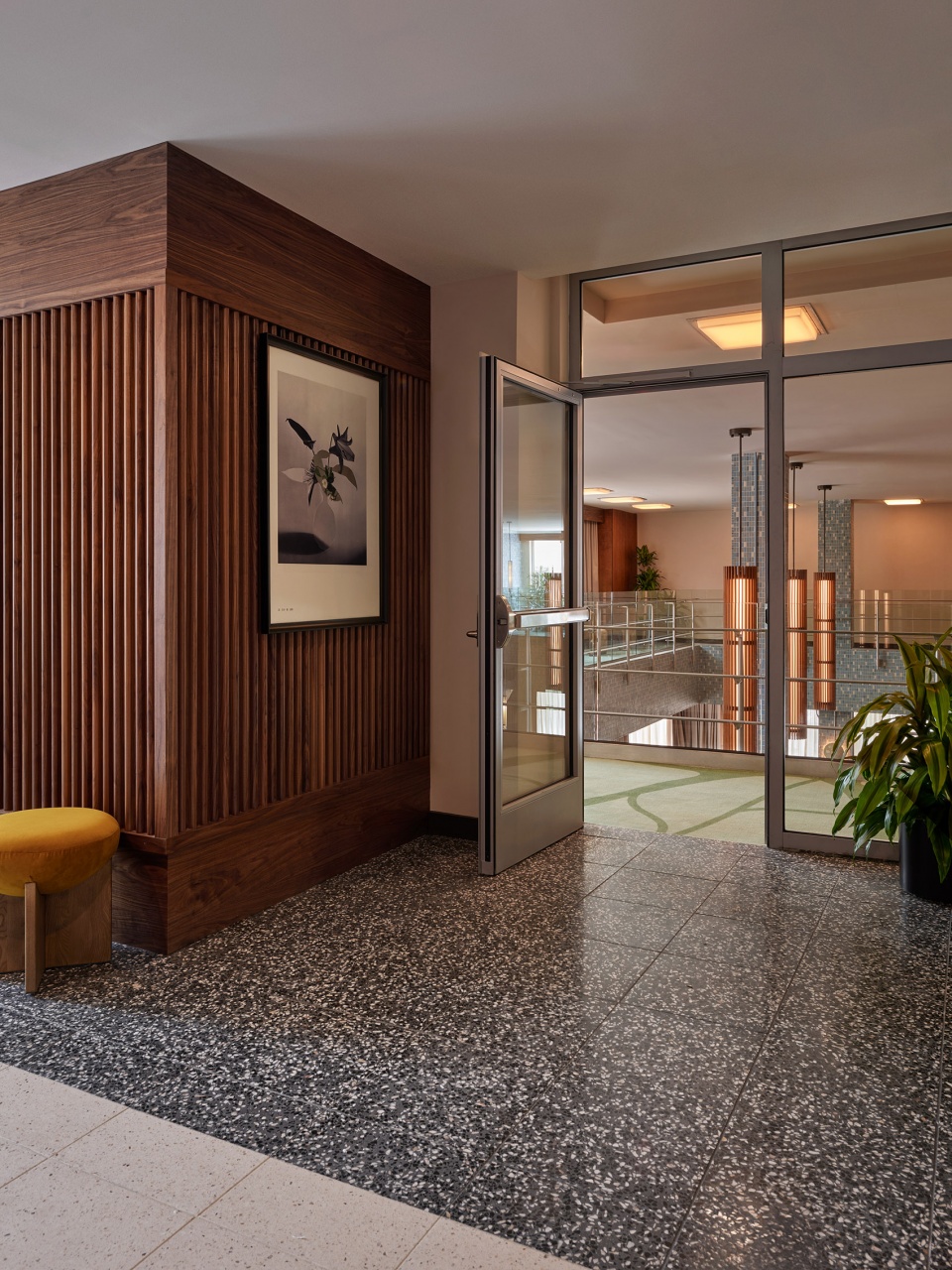 The former First Federal Savings and Loan Association building, constructed in 1961 by Levy and Kiley, features grey granite walls, white concrete frames, and distinctive blue mosaic tile. As a landmarked structure, the building’s original design was largely preserved. AAmp Studio focused on restoring existing elements, like the blue mosaic tile and aluminum framing, and introducing new design elements that complemented the original aesthetic without simply replicating it. The building’s hard-edged, rectilinear form is softened by the addition of warm textures, tones, and curvilinear geometries, creating a clear distinction between the historic structure and AAmp’s contemporary interventions.