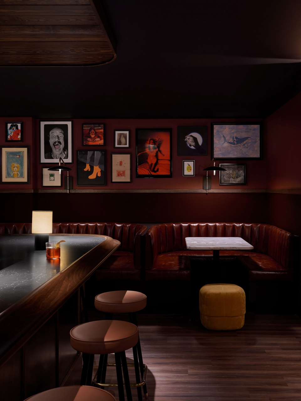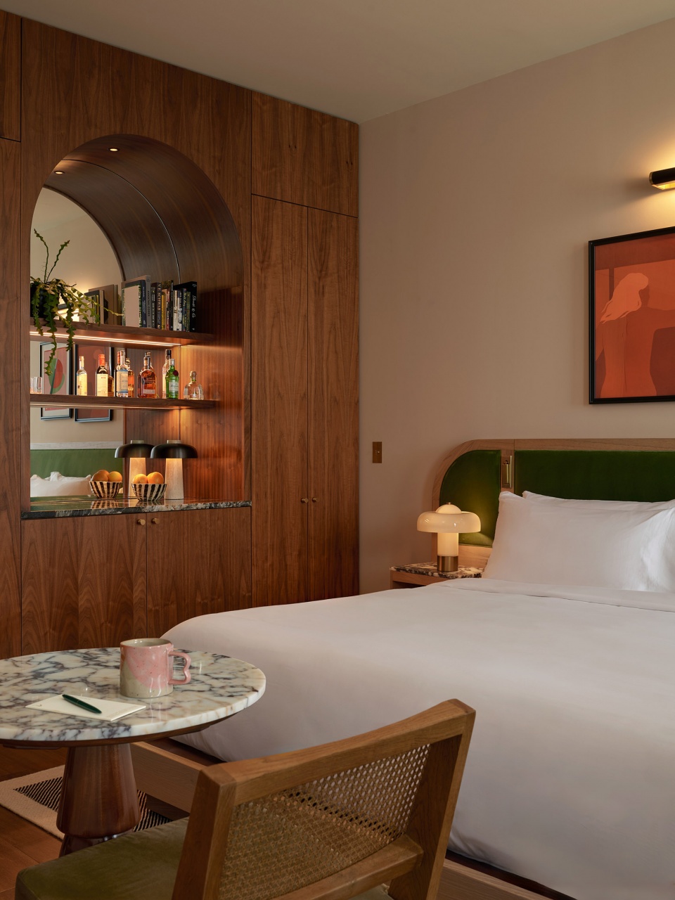 The guest rooms, located on the mezzanine through the sixth floors, reflect a quieter “Finnish modern” influence. The rooms, which range from Standard Queen to King Suite with Patio, feature a vestibule in a rich green hue, a millwork threshold leading to the main living area, and bathrooms with curved shower entries and red marble counters. Each room includes a marble bar top with a curated selection of spirits, coffee, tea, and glassware, reflecting the hotel’s focus on elevated cocktail experiences. Custom headboards made of wood and velvet, along with comfortable banquette seating areas, enhance the guest experience.