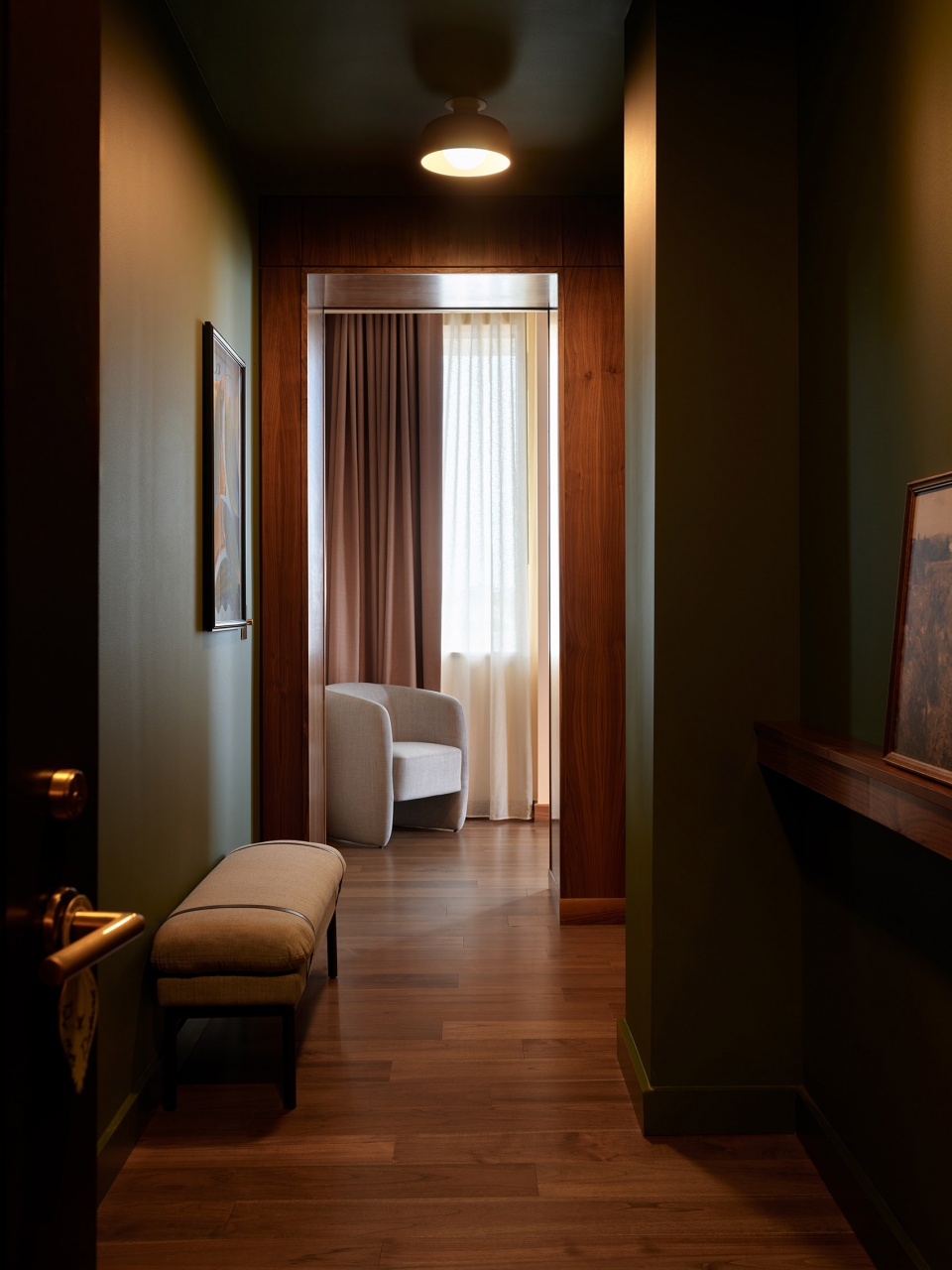 客房分布于夹层至六层,呈现更为克制的“芬兰现代主义”风格。房型从标准大床房(Standard Queen)到带露台的套房(King Suite with Patio)不等。客房入口设有深绿色门厅,通过定制木作过渡至主要起居区域;浴室采用弧形淋浴入口与红色大理石台面。每间客房均设有大理石吧台,配备精选烈酒、咖啡、茶与玻璃器皿,呼应酒店对高品质鸡尾酒体验的关注。木质与天鹅绒定制床头板以及舒适的卡座区域,进一步提升居住体验。