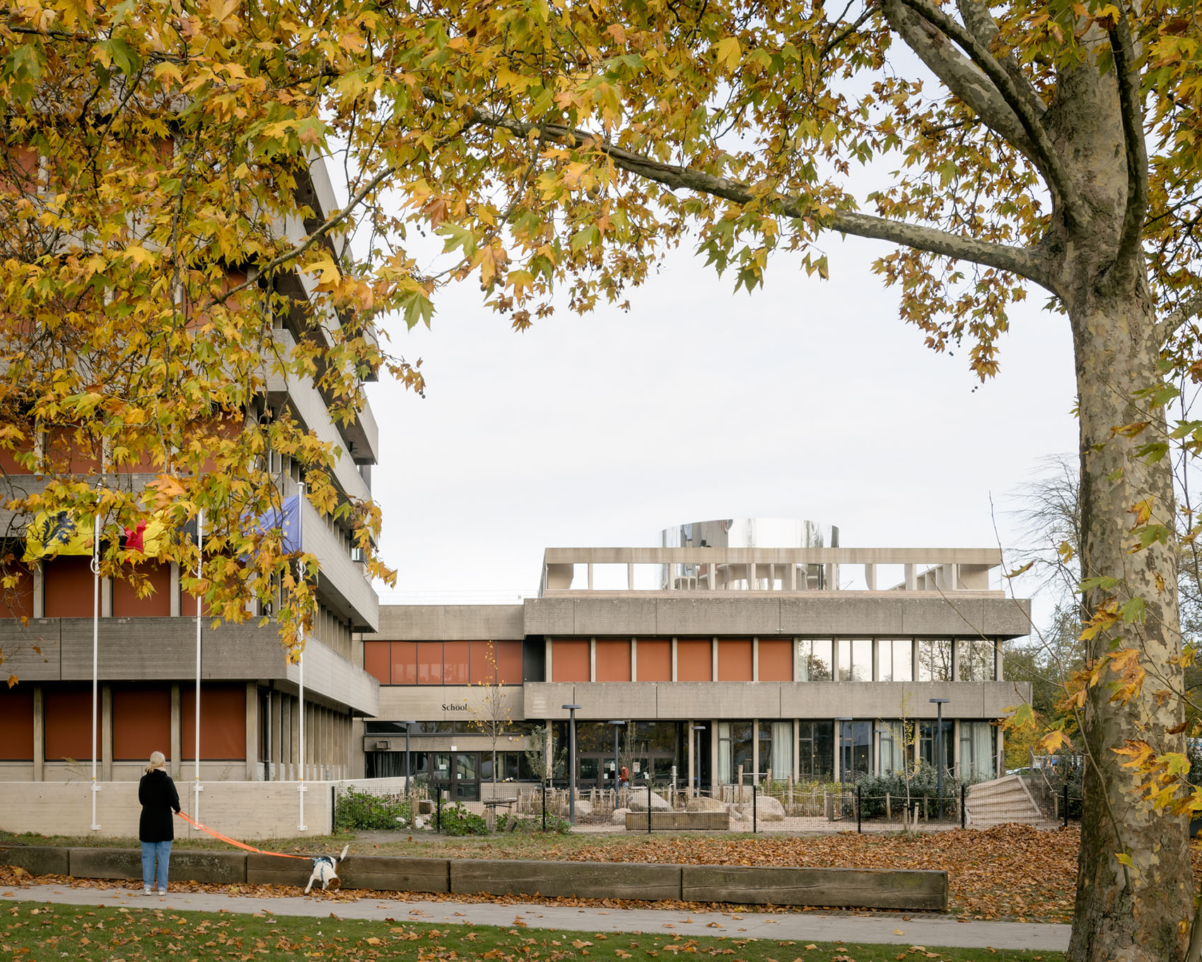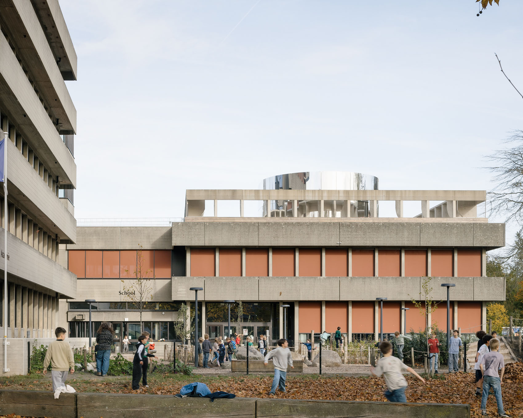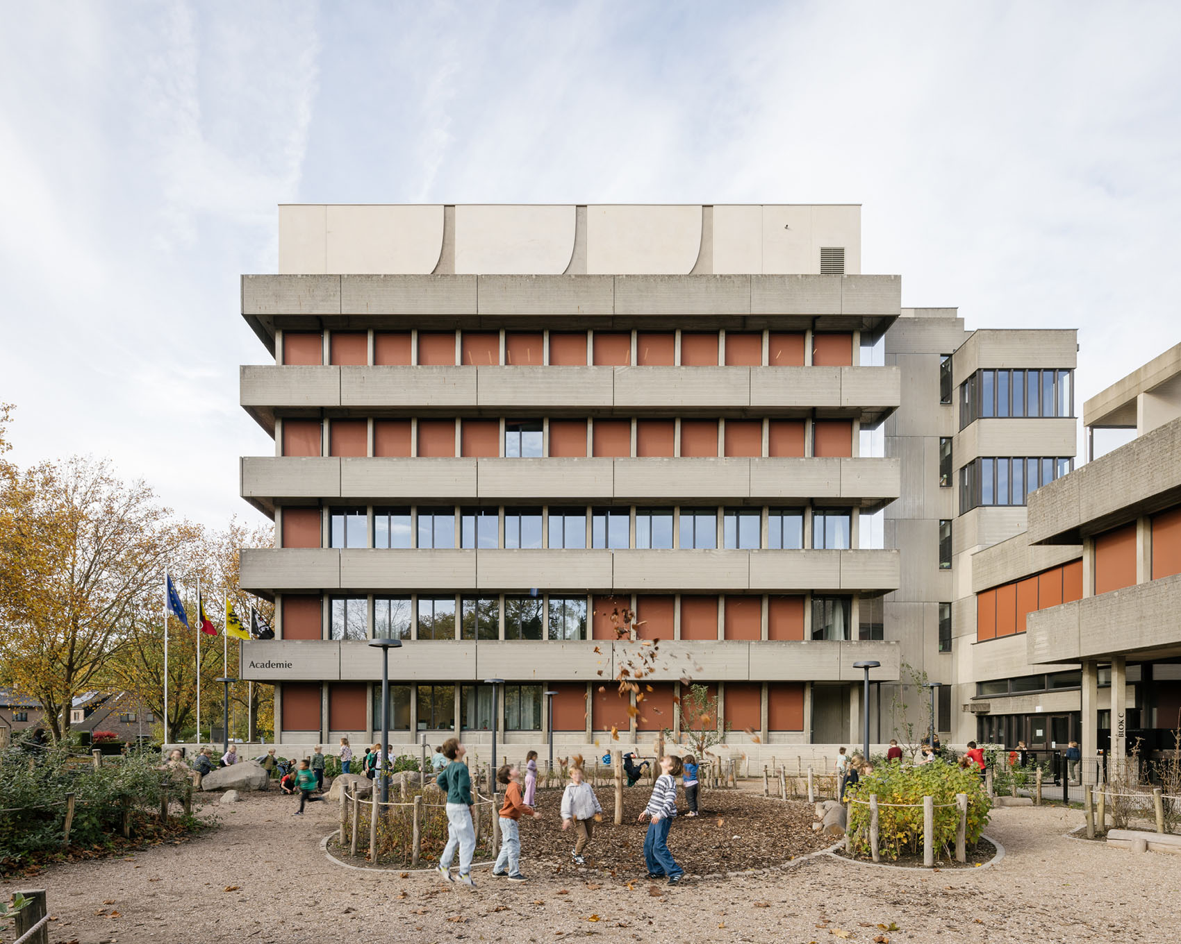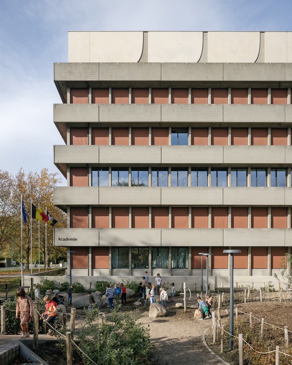 Concrete buildings from the 1970s are often dismissed as gray, dreary structures, to be demolished as soon as possible. Lightweight extensions in wood, steel, and glass frequently amplify this perception further. The design for De Felix—a multifunctional cluster that welcomes schoolchildren, users of the academy, the library, the police, and city administration—consciously chooses to ‘build on’ its concrete past. The concrete is not ‘cleaned up,’ but rather its weathering is embraced. By viewing the various hues of the concrete, the varied surface treatments and the many forms that the structure takes on as a rich set of tools, we can reverse the negative perception. Variations of the concrete columns, façade panels, and beams are thoughtfully added. The old and new are unmistakably related. The new elements revisit the rhythm of the existing structures while introducing softer edges and lines. The buildings are topped up and extended, as if the original design is being further developed. A new theater hall, featuring a load-bearing concrete façade, is seamlessly woven into the site.
